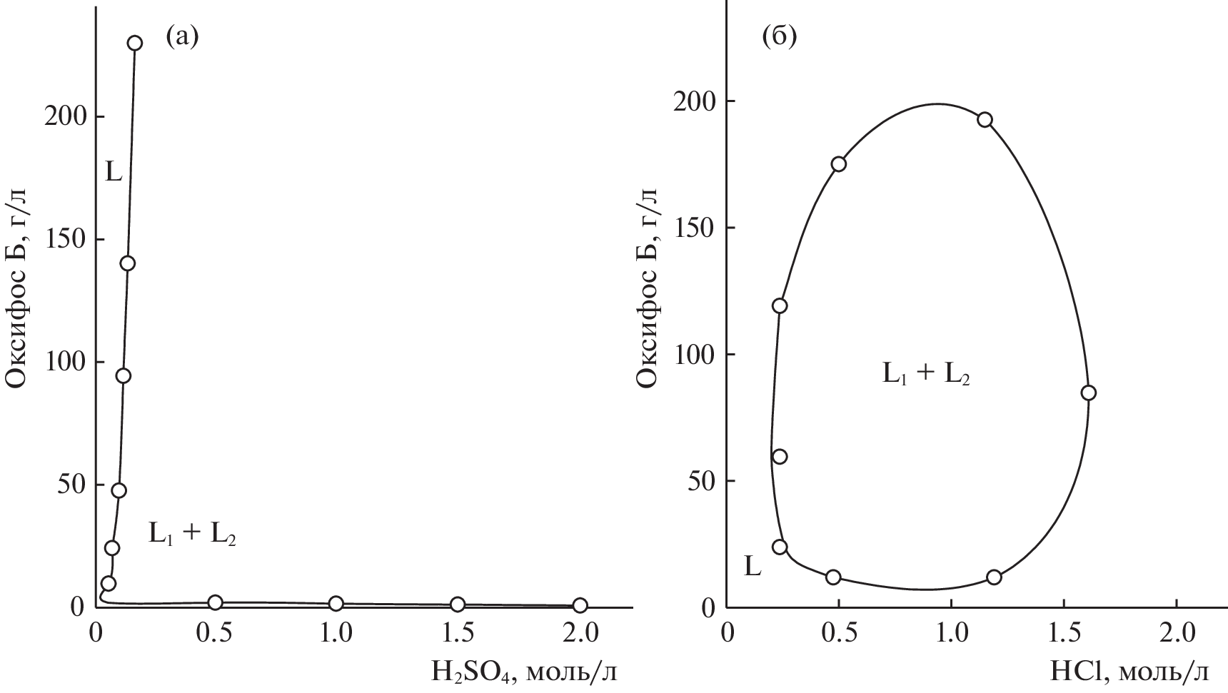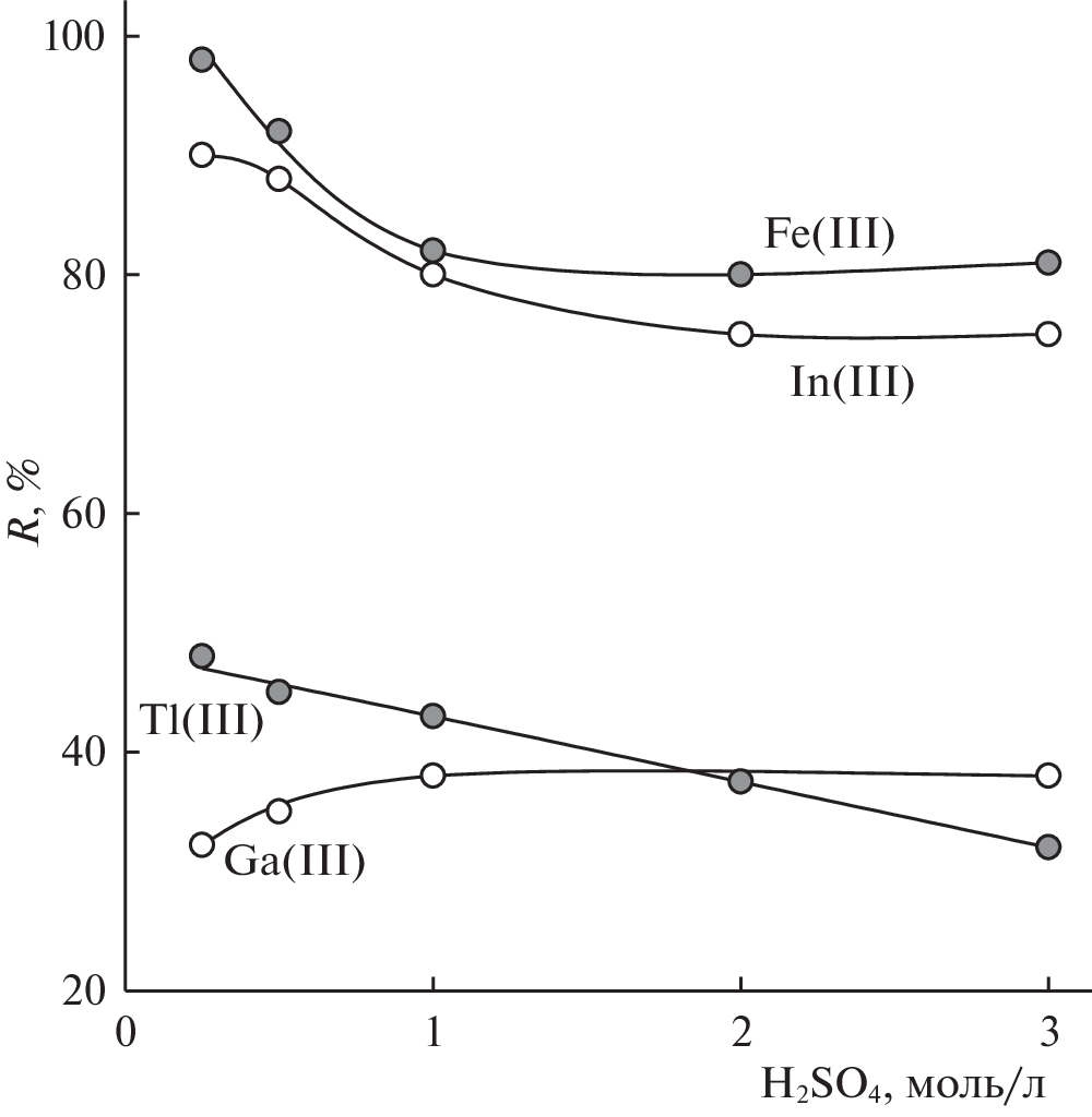 The boundaries of the segregation region in sulfuric (nitric, chloric, hydrochloric) acid–potassium bis(alkylpolyoxyethylene) phosphate–water systems at 25°С have been determined by isothermal titration. The salting-out ability of the inorganic acid was found to increase with a decrease in the absolute value of the Gibbs energy of anion hydration. Based on the obtained diagrams, the optimum parameters of extraction were determined, and tendencies in the distribution of some metal ions in the sulfuric acid–potassium bis(alkylpolyoxyethylene) phosphate–water system were studied. Conditions for quantitative extraction of thallium(III) in the presence of alkali metal halides were found.
