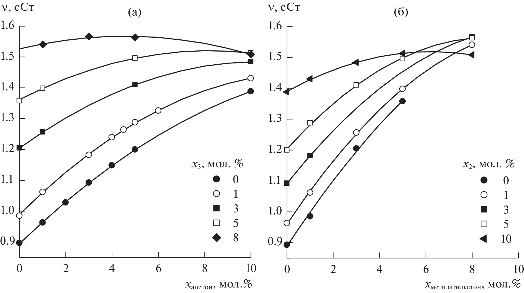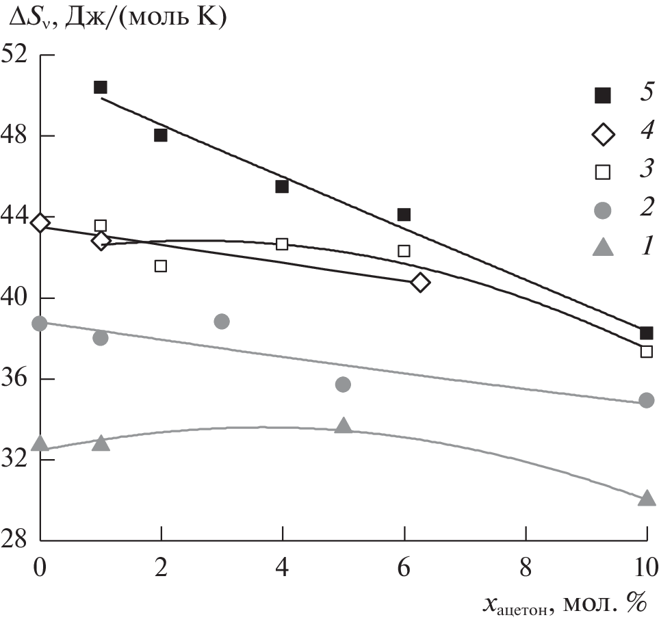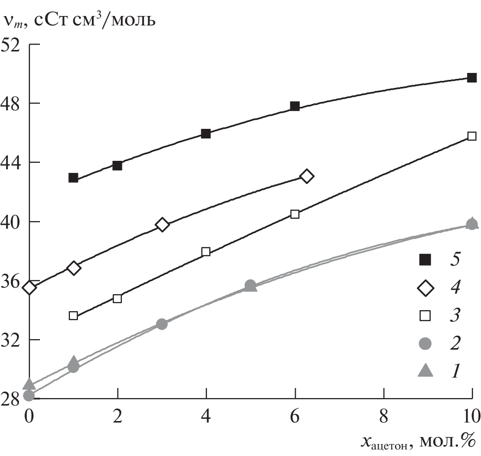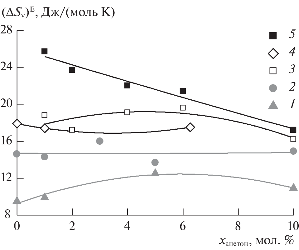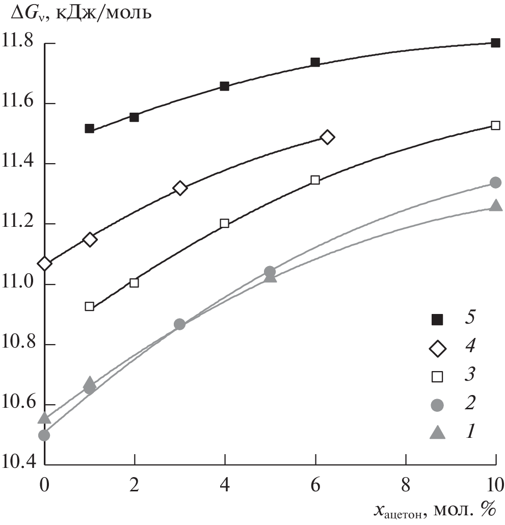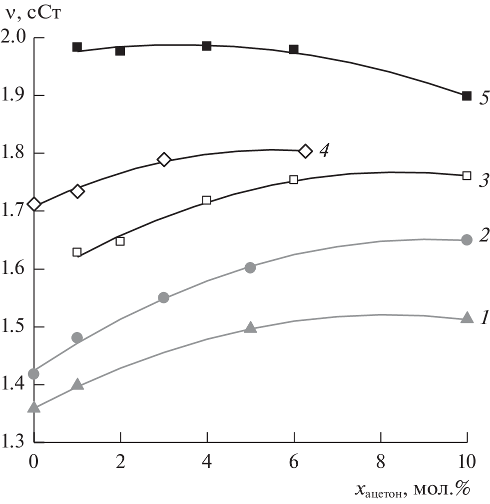 Values of kinematic viscosity and density are determined for water–acetone–methyl ethyl ketone solutions for the first time in the region of high contents of water and the 20–40°C range of temperatures. Results are used to calculate the molar kinematic viscosity (νm), the Gibbs energy of viscous flow activation (ΔG≠νΔ), and the entropy of viscous flow activation. The viscometric characteristics of this system are compared to those of water–ethanol–acetone, water–2-propanol–acetone, and water–2-butanol–acetone systems studied earlier. Dependences on the concentration of one organic component at a fixed content of a second are presented for different properties. The viscometric parameters of ternary solutions with methyl ethyl ketone, calculated based on size/molecular weight of the components (νm and ΔG≠νΔ), are close to those obtained for solutions with ethanol but notably higher for solutions with 2-propanol and 2-butanol. It is concluded that molecules participating in the formation of intermolecular hydrogen bonds as proton donors (alcohols) raises viscosity more than an increase in size/mass (methyl ethyl ketone). Different ways of calculating the entropy of viscous flow activation (ΔS≠νΔ) are compared on the basis of literature data. It is found that ΔS≠νΔ is higher than that of water in the studied range of concentrations of the ternary water–acetone–methyl ethyl ketone system, which is also typical of other aqueous solutions.