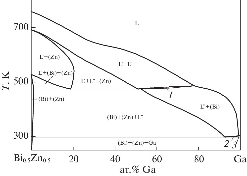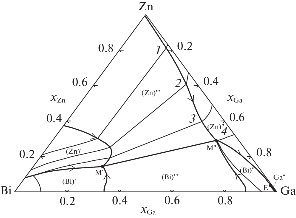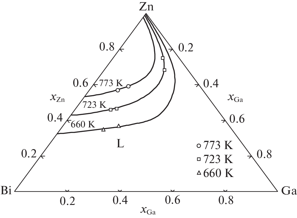 Experimental data are used to build a thermodynamic model for the liquid phase of the Bi–Ga–Zn system. The model and those of other phases are used to determine coordinates of the invariant points of the Bi–Ga–Zn system and the projection of its liquidus surface. The polythermal cross-section of the system’s phase diagram is calculated for compositions xBi/xZn = 1, along with the isothermal cross section at 573 K.