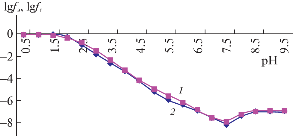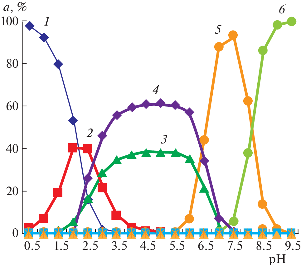 Processes of the formation of coordination compounds in the Fe(II)–Fe(III)–H2Sal–C2H5OH–H2O system are studied using the Clark–Nikolsky oxidation potential at a temperature of 298.16 K and an ionic strength of the solution of 1.0 mol/L against a sulfate background. The formation of complexes of the following compositions is established: [FeHSal(H2O)5]2+, [Fe(HSal)2(H2O)4]+, [Fe(HSal)2OH(H2O)3]−, [Fe(HSal)2(OH)2(H2O)3]3−, [FeIIIFeII(HSal)2(OH)2(H2O)8]+, [FeHSal(H2O)5]+, [Fe(HSal)(OH)(H2O)4]0, [FeIIFeIII(HSal)2(OH)2(H2O)8]+. The constants of formation of all complexes are calculated via iteration of the oxidizing function, and the areas of their dominance and maximum degrees of accumulation are determined.