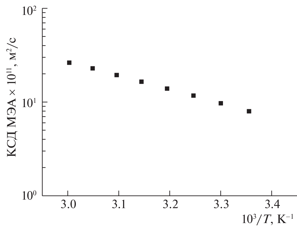 Self-diffusion coefficients (SDCs) of 3-amino-1-propanol (3AP), monoethanolamine (MEA), and water molecules are measured via 1H NMR using a pulsed magnetic field gradient and a stimulated echo sequence throughout a range of concentrations at temperatures of 293–333 K. It is found that the studied amino alcohols and water form a nearly tetrahedral three-dimensional network of hydrogen bonds between the molecules of the system. It is shown that this network is stable in the liquid phase, despite the mobility of the molecules that constitute the network. The mechanism of molecular mobility is studied. It is shown that the SDC of the molecules of the above amino alcohols and their aqueous solutions depends linearly on temperature. It is concluded that the molecular mobility mechanism has a pattern of activation. To verify this hypothesis and interpret the mechanism, the energies of activation are calculated for the self-diffusion of all the studied molecules in water–amino alcohol systems. The determined energies of activation for the mobility of amino alcohol molecules in aqueous systems have similar values, suggesting they undergo interactions that produce either mixed water–amino alcohol spatial networks or amino alcohol–water molecule associations in the liquid phase.