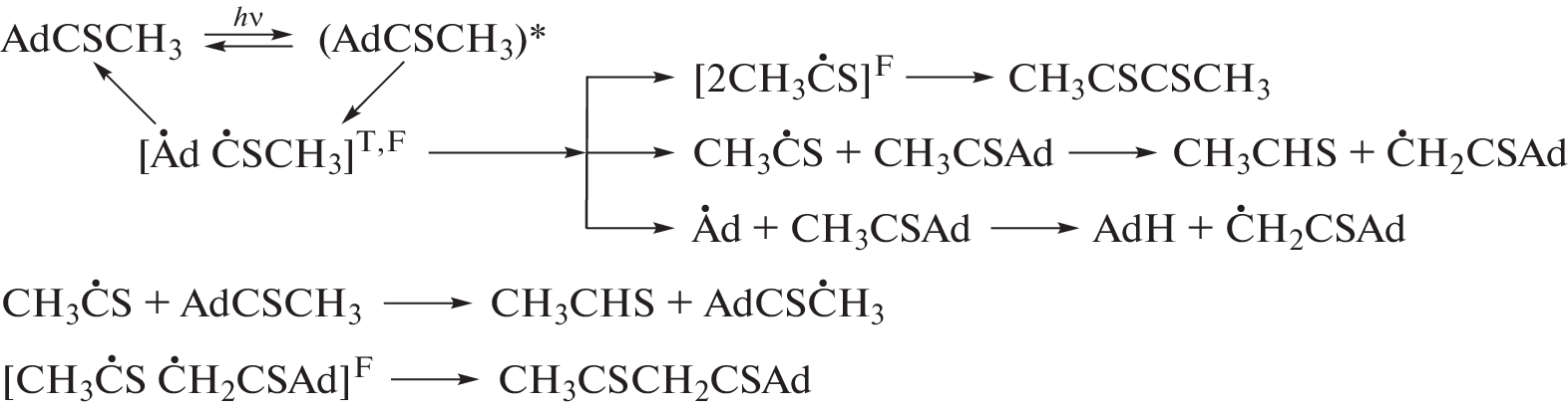 The article presents the results of our study of the mechanisms of the photoreactions of methyladamantylthione AdCSCH3 (I) using chemical nuclear polarization (CNP) effects, which show themselves in the NMR spectra. While pulsed and laser photolysis allows us to study the kinetics of death and accumulation of intermediates released from the solvent cell, the use of CNP allows us to study cell processes in detail. The elementary acts of the reaction were established and proved experimentally.