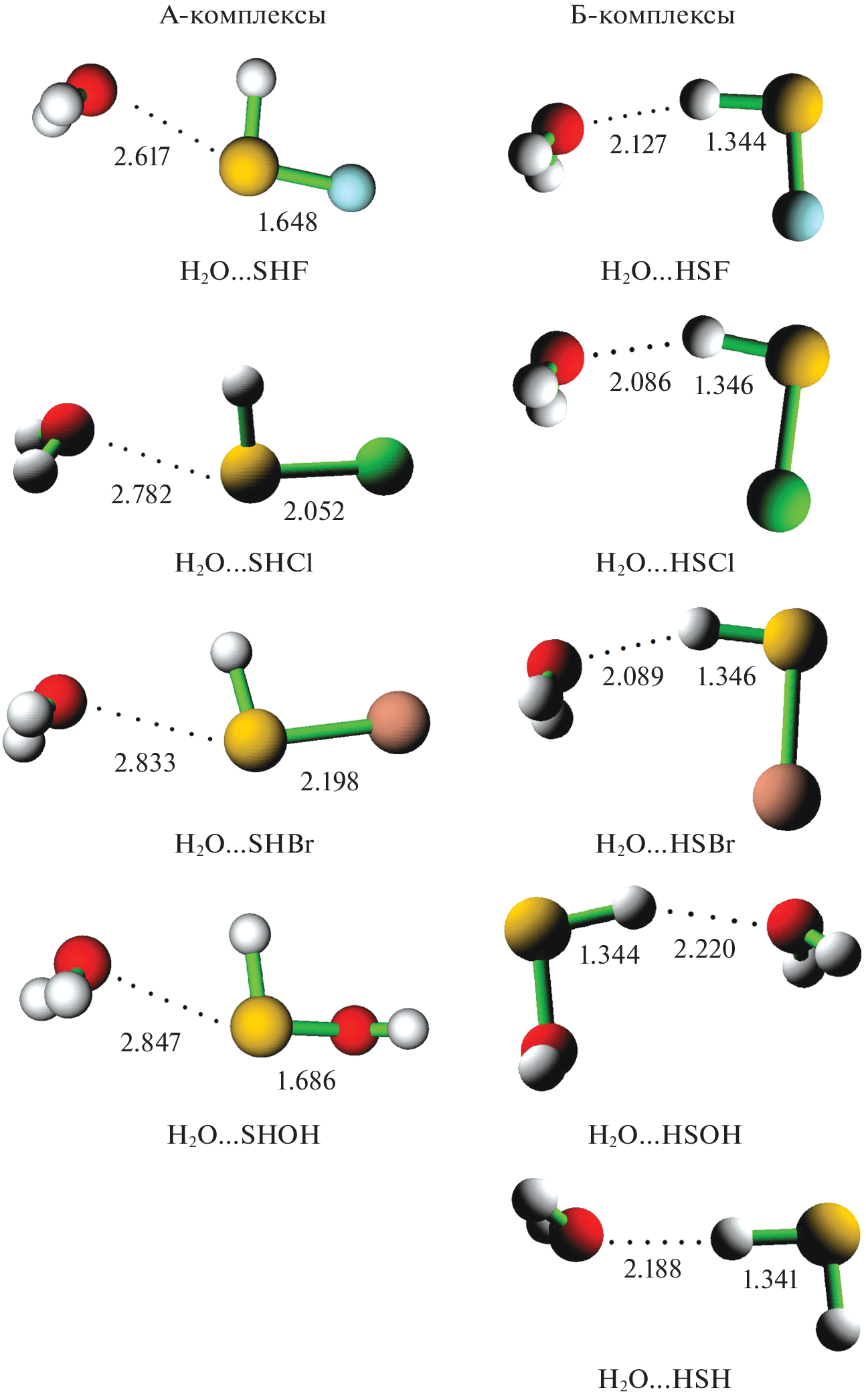 Binary complexes with a chalcogen (A complexes) and hydrogen (B complexes) bond formed by SHX molecules (X = F, Cl, Br, OH) of divalent sulfur and a water molecule have been calculated by the MP2/aug-cc-pVTZ quantum chemical method. An NBO analysis was performed for complexes of both types along with the topological analysis of electron density and decomposition of the binding energy into components. The quantum chemical calculations showed that the binding energies, interorbital interaction energies of monomers, and electron densities at the critical point (3, –1) of intermolecular contact are close in the A and B complexes. The main contribution to stabilization of the complexes is made by the electrostatic interaction; in the B complexes, however, the contribution of the charge transfer component is also significant. The dispersion energy plays a significant role in the binding of monomers in complexes of both types. According to the calculations, the interconversion of A and B complexes occurs with a very low activation barrier.