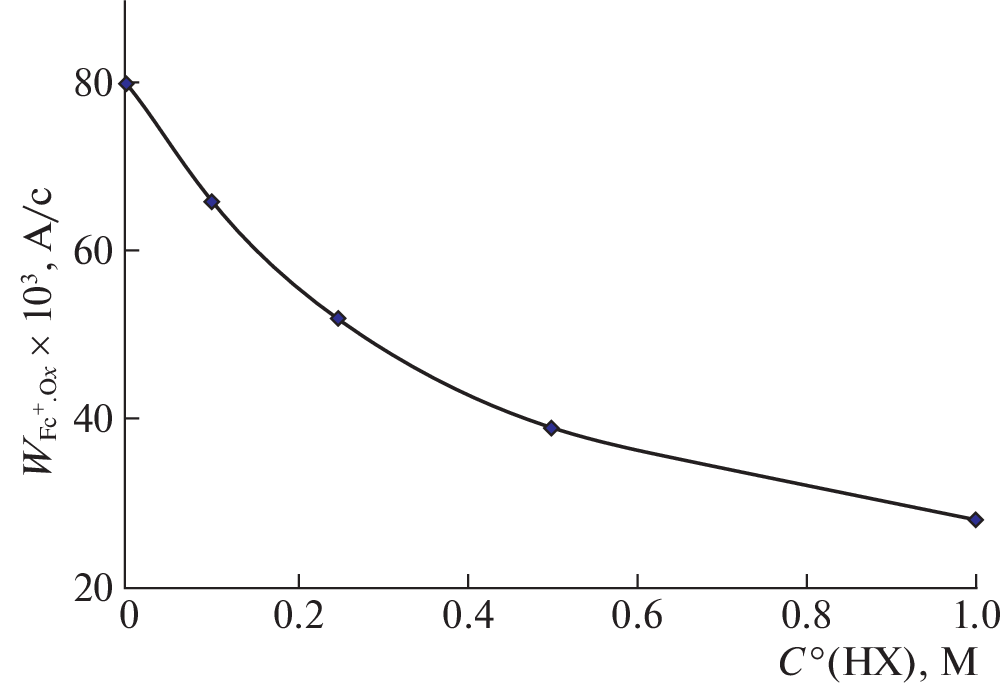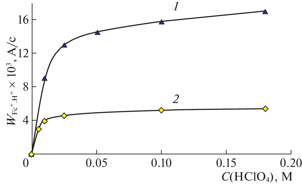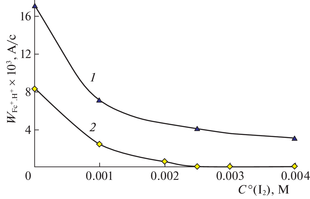 It is established that the rate of the formation of ferrocenium cations in reaction mixture acetylferrocene (1,1'-diacetylferrocene) + I2 + HClO4 as a result of the protonation of metal complexes (MCs) and their oxidation with iodine in dioxane and acetonitrile depends on different mechanisms and is described by kinetic equations obtained by analyzing schemes of the process. The observed difference is due to different roles of the protonation of metal complexes and their oxidation with iodine in these solvents.