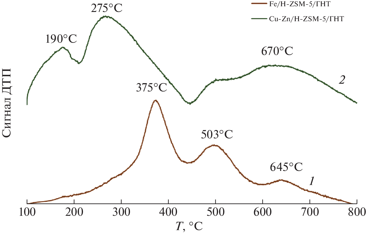 Iron- and Cu–Zn-containing carbon dioxide hydrogenation catalysts based on natural aluminosilicate nanotubes and zeolite H-ZSM-5 are synthesized. Their textural and acidic properties are studied via low-temperature nitrogen adsorption–desorption, temperature-programmed desorption of ammonia, temperature-programmed reduction of hydrogen, and elemental analysis. The effect the temperatures of the reaction have on the conversion of CO2 and distribution of its product is studied. Catalysts based on aluminosilicate halloysite nanotubes exhibit methanol and С2–С4 hydrocarbon selectivities of 88 and 16%, respectively.