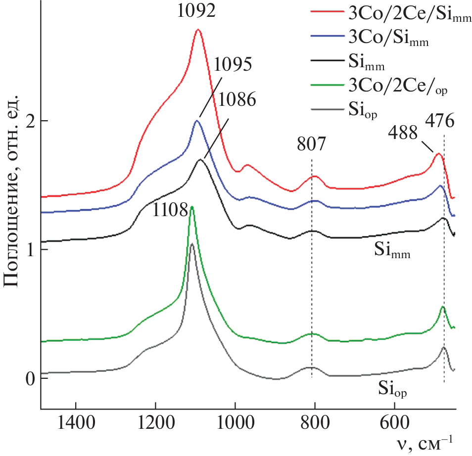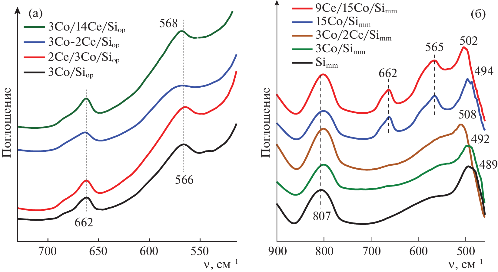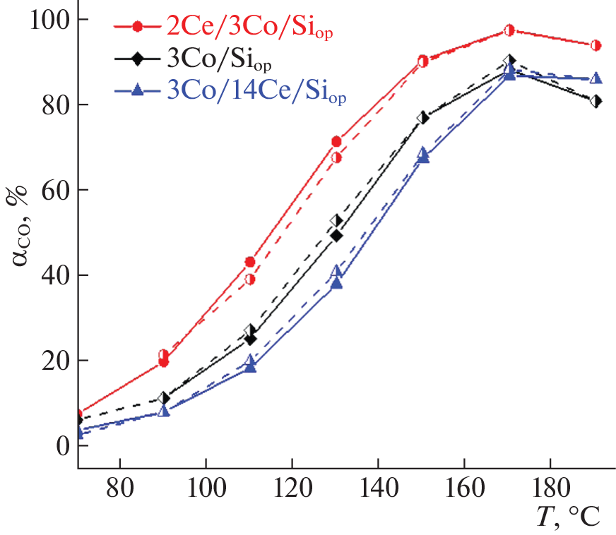 Two types of nanosilicas with different pore structures are synthesized and decorated via impregnation with cobalt and cerium oxides. Meso–microporous spherical silica particles with thin walls of SiO2 nanochannels having specific surface area and pore volume of up to 1400 m2/g and 0.8 cm3/g, respectively, are used. Macroporous three-dimensionally ordered structures based on SiO2 (so-called synthetic opals) consisting of close-packed submicron spherical silica particles with respective porosity characteristics of 11 m2/g and 0.2 cm3/g are also used. The synthesized materials are characterized via low-temperature nitrogen adsorption, X-ray diffraction, SEM, XPS, and Fourier transform IR spectroscopy, and tested as catalysts for the selective oxidation of CO in excess H2 (CO-PROX). The effect of silica, the ratio of introduced oxides, and the order of their introduction on the structure and catalytic properties of Co–Ce/SiO2 are revealed. The catalytic behavior of the synthesized materials is determined from the specificity of interactions among the metal oxides and with the silica surface.