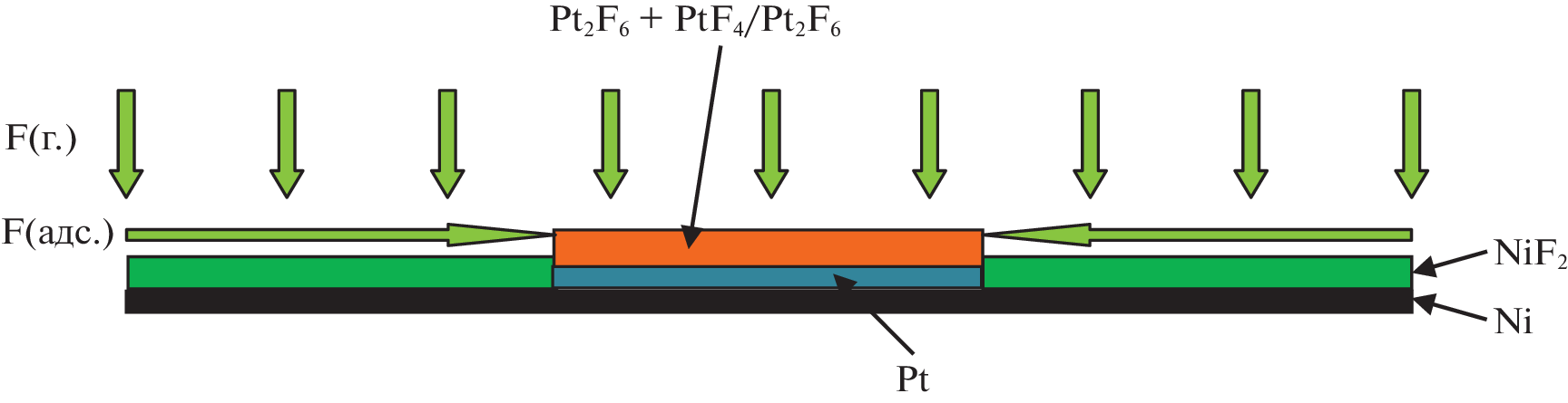Fluorination with atomic fluorine seems to be a promising way to functionalize materials, since such processes occur in a wide temperature range with an activation barrier close to zero. Here we demonstrate the ability to control the fluorination of platinum with atomic fluorine using surface migration (diffusion) of adsorbed fluorine atoms (Fads). A change in the concentration of fluorine atoms in the reaction zone is achieved by a change in the direction and magnitude of the diffusion flux of Fads due to the formation of alternative reaction zones. The occurrence of diffusion fluxes is determined by the area of contact of surfaces with the main and alternative reaction zones, which provide conductivity for Fads. The developed approach made it possible to experimentally establish the achievement of equilibrium in the reaction PtF4(g) + 2F(g) = PtF6(g) and measure the equilibrium constant.