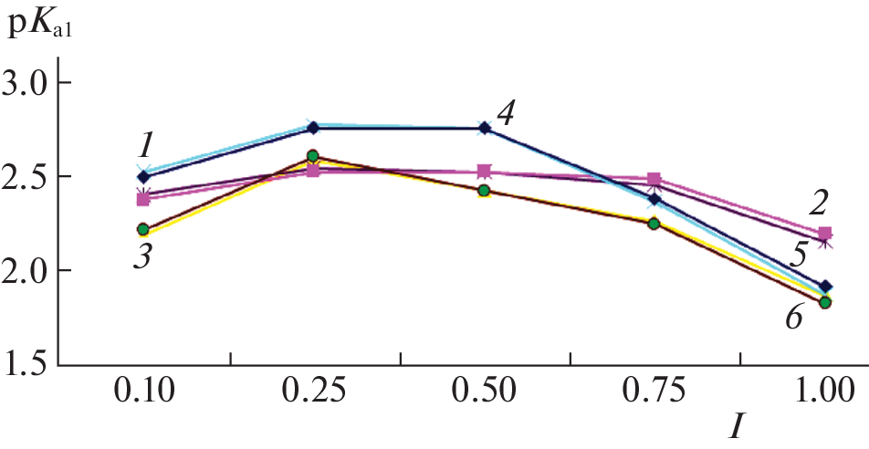 Processes of alanine ionization are studied via potentiometry at a temperature of 298.15 K and different ionic strengths of a NaHClO4 solution. Constants of the acid’s thermodynamic ionization are calculated at three concentrations of alanine. Different empirical and semi-empirical equations are used to calculate the coefficients of ionic activity in terms of the second and third approximations of the Debye–Hückel theory. Values of pKa1 and pKa2 are calculated at 298.15 K, solution ionic strengths of 0.1, 0.25, 0.5, 0.75, and 1.0 mol/L, and concentrations of 1.0 × 10−3–3.0 × 10−3 mol/L with a confidence level of P = 0.95.
