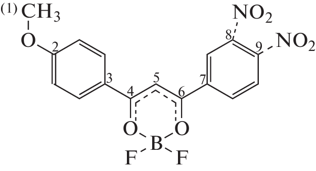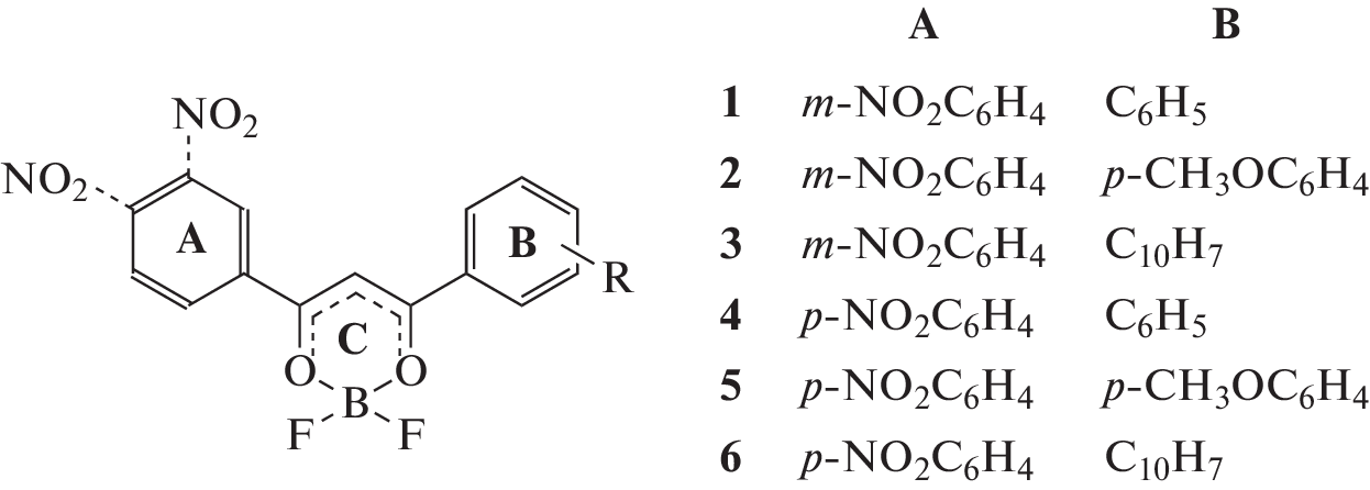 The luminescent properties of p- and m-nitrodibenzoylmethanates of boron difluoride are studied by via quantum-chemical modeling in combination with stationary and time-resolved luminescence spectroscopy. The effect the position of the nitro group has on the luminescent properties of the complexes has been revealed. In the series of donor substituents (phenyl, naphthyl, p-methoxyphenyl), compounds with p‑methoxyphenyl have the highest yield of luminescence quanta. The nitro group in the p-position (in contrast to the m-position) greatly reduces the yield of luminescence quanta. The formation of exciplexes is observed in the solutions of complexes in benzene, increasing the yield of luminescence quanta and creating a strong bathochromic shift of the luminescence spectrum’s maximum.