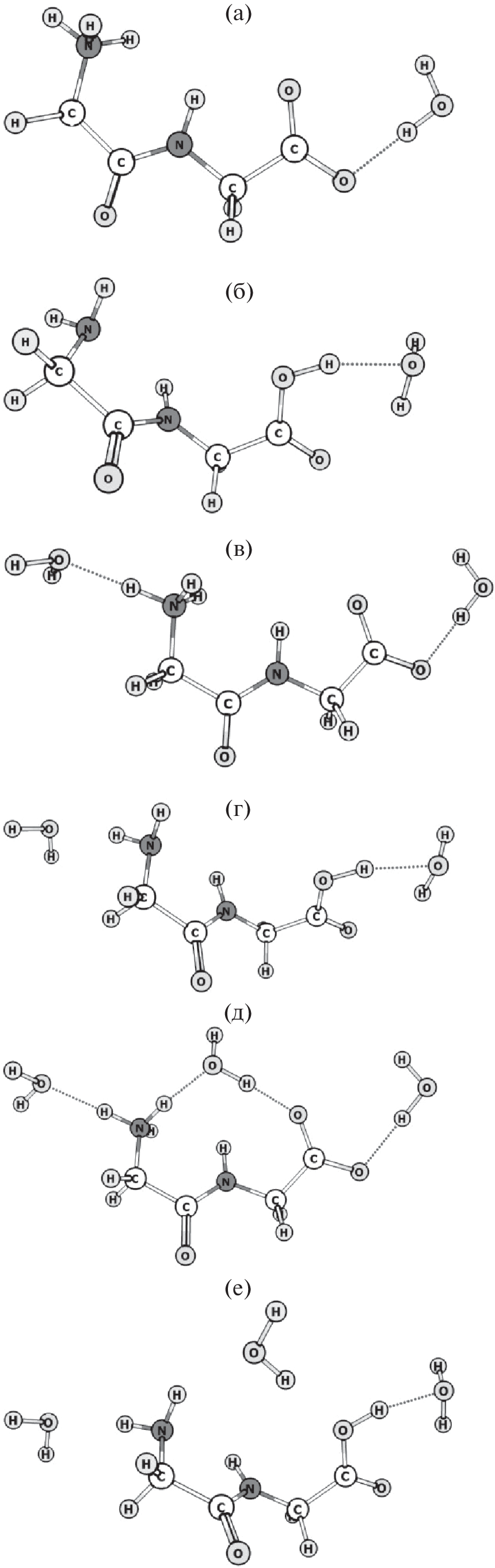 Quantum-chemical calculations of the structure of the molecular forms of glycine and glycylglycine and conjugate ionic forms have been performed. Our own and published data on the thermodynamic characteristics of the reactions of acid–base interactions of glycine and glycylglycine in aqueous organic solutions are summarized, and the influence of the composition of mixed solvents on the acid dissociation constant of the amide group in the copper(II) peptide complex is considered.