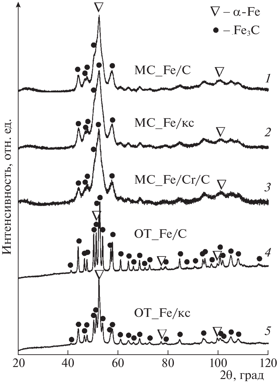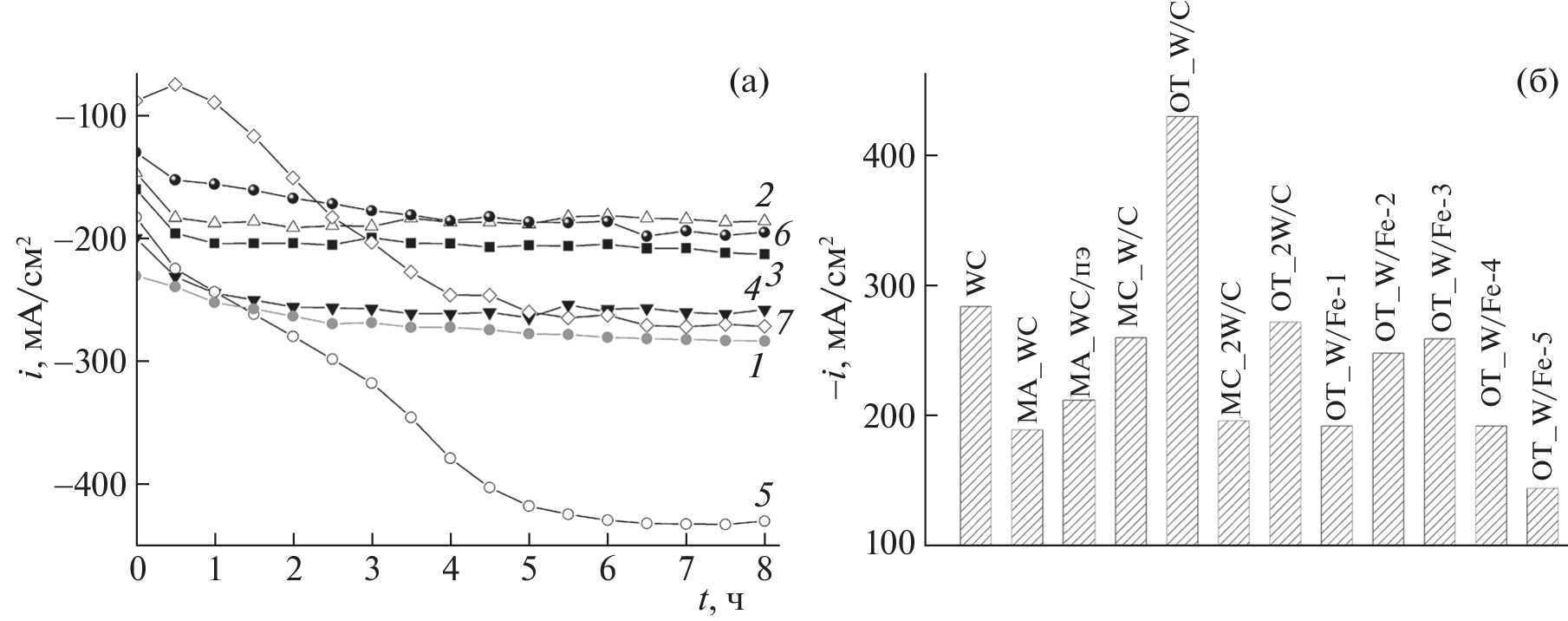 The electrocatalytic activity of a number of mechanically activated/mechanically alloyed carbide phases of iron and tungsten and Fe3W3C and Fe6W6C bimetallic carbides in the evolution of hydrogen has been studied. Electrocatalysts have been prepared by compacting carbide particles with polyaniline as a conducting polymer. The highest activity is exhibited by Fe3C and WC nanocrystalline particles. Metallic phases in the composition of the particles slow down the rate of hydrogen evolution. Subsequent annealing of these particles transforms metallic phases to bimetallic carbides and accelerates the hydrogen evolution. The activity of the phases of Fe3W3C and Fe6W6C bimetallic carbides in the hydrogen evolution is fairly high, but they are inferior to the Fe3C and WC nanocrystalline particles.