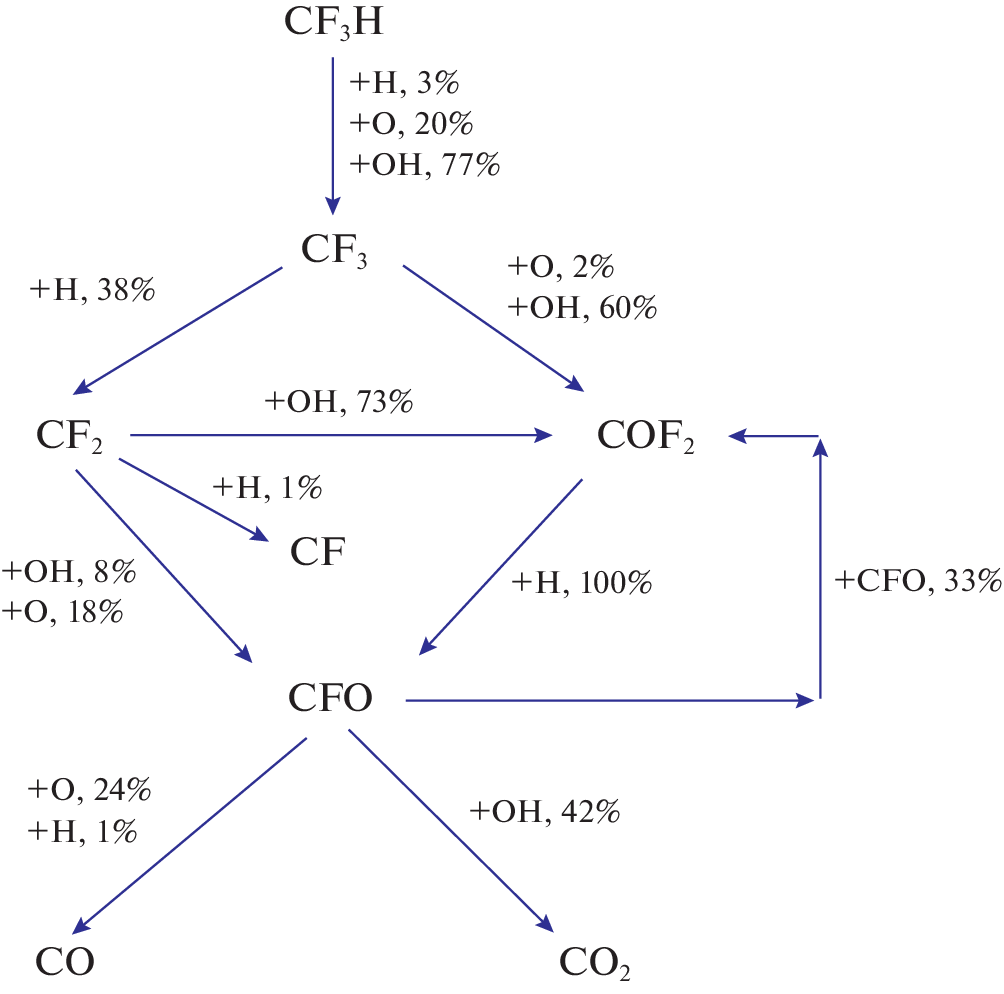 На основании известных экспериментальных данных по концентрациям промежуточных веществ и с учетом только тех элементарных реакций, кинетические параметры которых известны, выполнен расчет механизма превращения CF3H в пламени смесей метана с кислородом различного состава. Показано, что CF3H в пламени смеси СН4/О2 деструктурирует в реакциях с H, О и ОН без регенерации, что опровергает распространенные до настоящего времени классические представления о том, что превращение исходных реагентов в пламени протекает по молекулярному пути. В богатой смеси превращение в основном протекает за счет реакций CF3H, CF3, СF2, COF2 с атомарным водородом, за счет конкуренции со стадией разветвления реакционных цепей обеспечивающих ингибирование горения метана в кислороде. В стехиометрической и особенно в бедной смеси возрастает роль окислительных процессов с участием О и ОН, и эффект ингибирования слабеет. Полученная схема качественно описывает всю известную экспериментальную картину, наблюдаемую при горении смесей СН4/O2/CF3H.