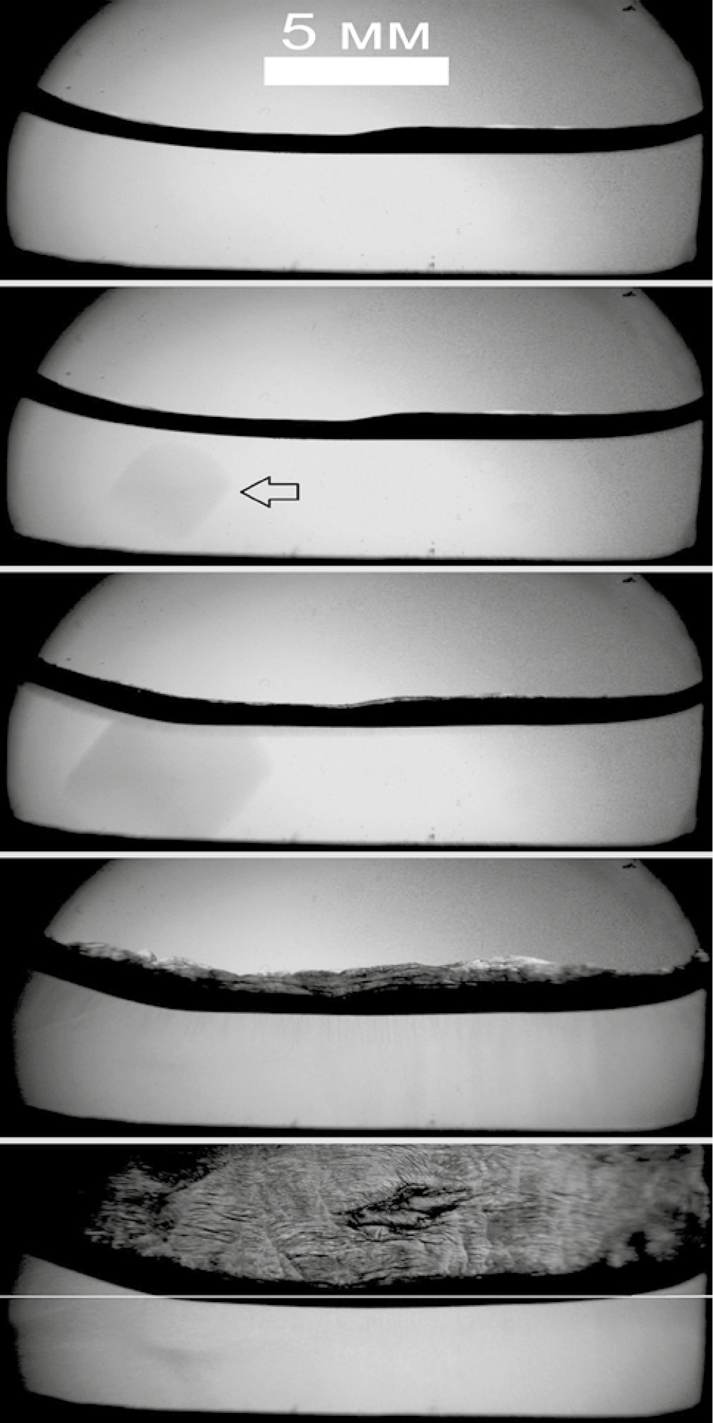 Рис. 5. Различные стадии роста гидрата метана из 2 мас. % раствора малоновой кислоты. Исходное состояние образца (а). Появление кристалла гидрата метана на поверхности контакта стекло – раствор, кристалл указан стрелкой (б). Растущий на поверхности контакта стекло – раствор кристалл гидрата коснулся линии раздела раствор – стенка – газ, начался рост пленки гидрата на поверхности раствора и рост игольчатых кристаллов гидрата в объем раствора (в). Начало «выползания» кристаллов гидрата на стенку ячейки (г). Полное зарастание гидратом стенок ячейки. Исходный уровень раствора отмечен белой линией (д).