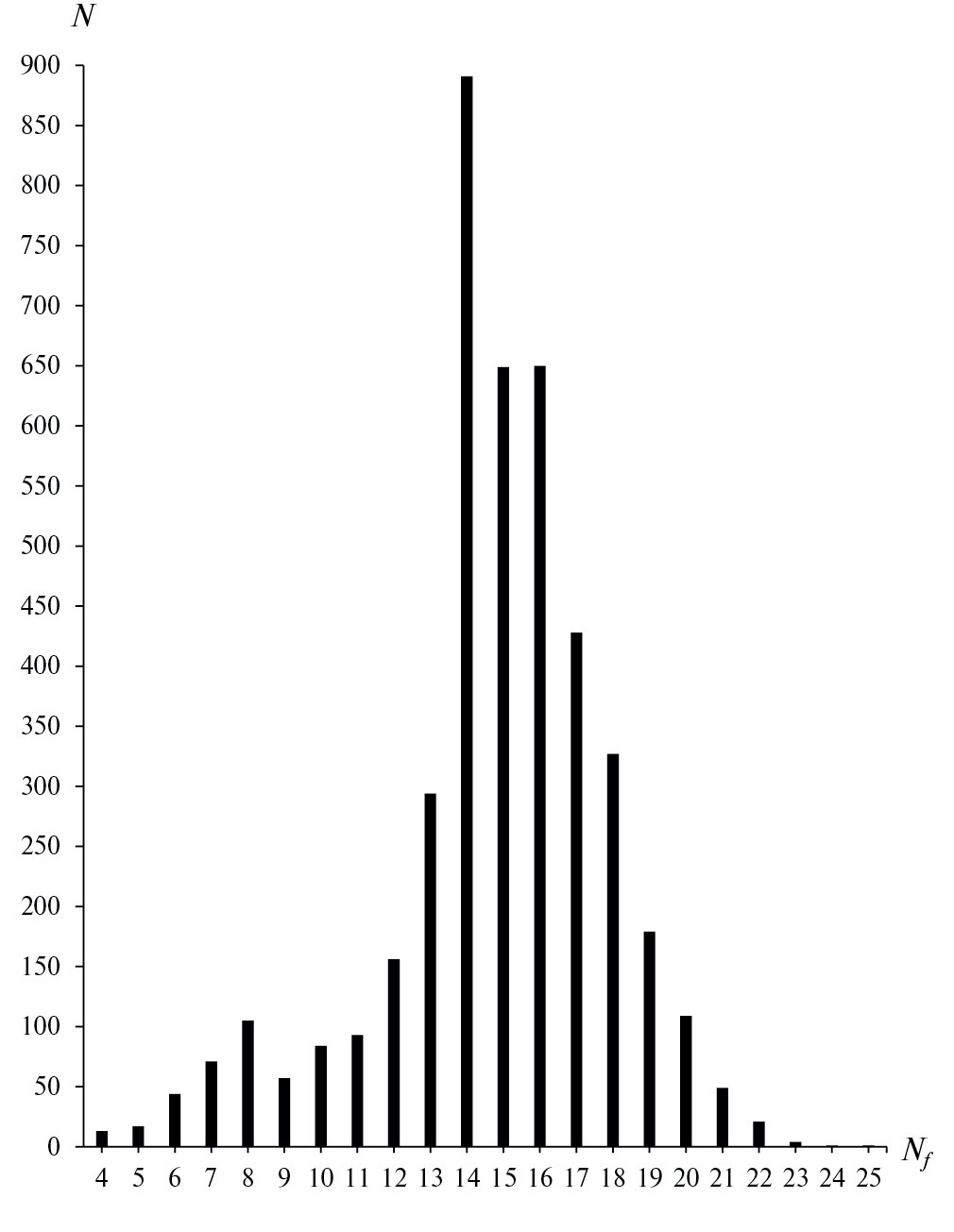 Проведенный нами анализ показал, что в Si-подрешетках кристаллов кремнийорганических соединений общей формулой SiaCbHc (a, b, c – стехиометрические коэффициенты) число граней ПВД, обозначающееся символом Nf и равное числу атомов кремния, окружающих базисный атом Si, изменяется от 4 до 25 (рис. 5). Согласно полученным данным, в Si-подрешетках наиболее характерными являются ПВД, величина Nf которых равна 14. На долю таких 14-гранников приходится 891 ПВД, что соответствует примерно 21.0% от объема изученной выборки. Следующими по частоте реализации после ПВД с Nf =14 оказываются 15- и 16-гранники – в охарактеризованной выборке их содержится 649 и 650 полиэдров соответственно, что составляет всего по 15.3% на каждый. ПВД атомов Si в Si-подрешетках, обладающие 17 гранями, по частоте встречаемости располагаются на четвертом месте – в изученной выборке содержится 428 таких ПВД (10.1%).