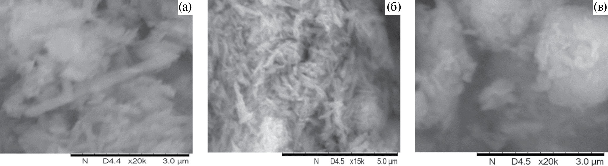 На рис. 1 приведены микрофотографии образцов галлуазита, полученные на сканирующем электронном микроскопе JEOL JSM-6000 NeoScope. По этим снимкам видно, что образцы Hal-1 и Hal-2 состоят в основном из трубчатых структур. В образце Hal-3 помимо трубчатых структур присутствуют сферические и пластинчатые структуры, а также их агломераты.