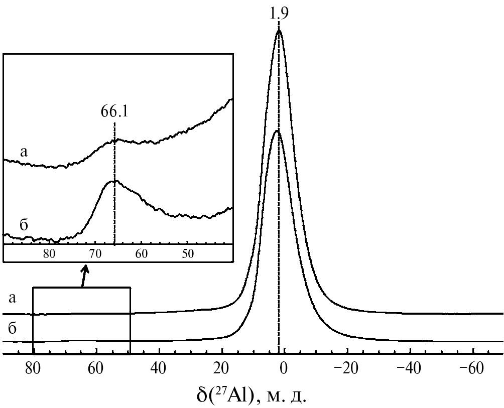 Рис. 2. Спектры ЯМР ВМУ на ядрах 27Al образцов Hal-1(а), Hal-2(б)