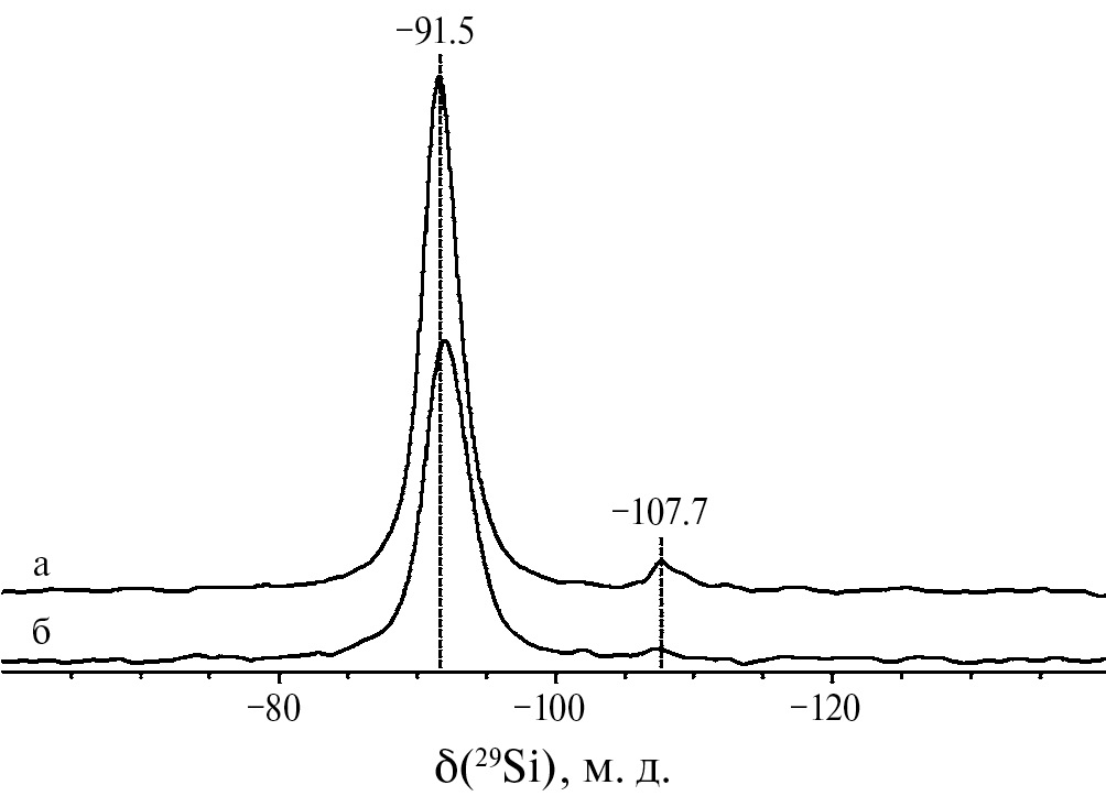 Рис. 3. Спектры ЯМР ВМУ на ядрах 29Si образцов Hal-1(а), Hal-2(б)