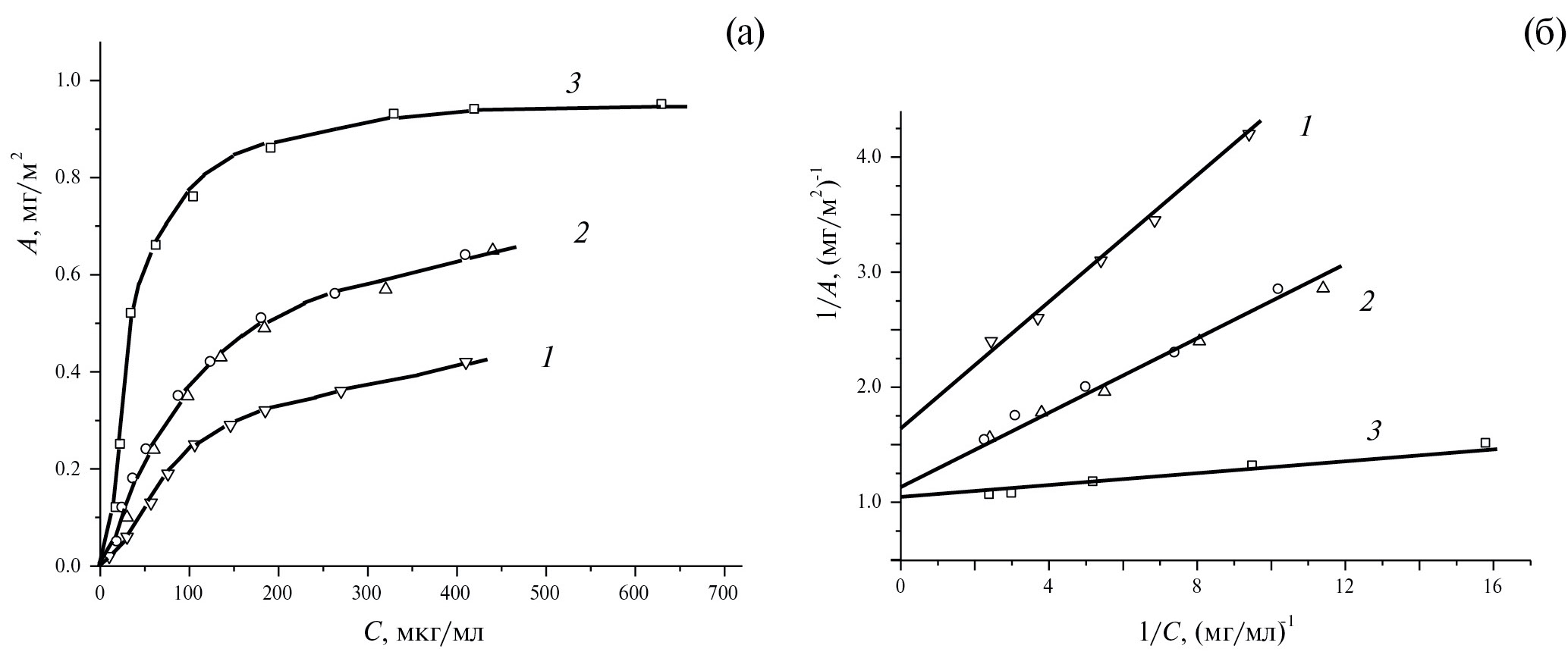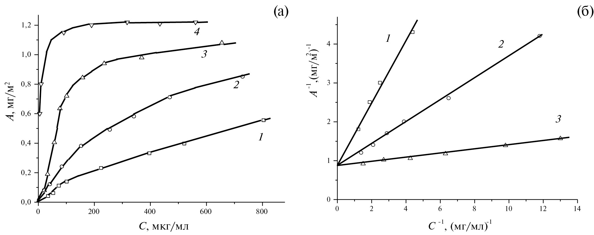 Из приведенного рисунка видно, что с возрастанием времени контакта белка с адсорбентом меняется величина адсорбции и вид изотерм. При временах адсорбции от 1 до 5 суток начальные участки изотерм имеют S-образный вид, но при концентрациях выше 100 мкг/мл спрямляются в линейных координатах уравнения Ленгмюра (рис. 4б). Изотермы адсорбции различных белков на других глинистых минералах также были описаны уравнением Ленгмюра [20]. При увеличении времени контакта гемоглобина и галлуазита до 15 суток величина адсорбции достигает предельной величины 1.25 мг/г, а изотерма приобретает вид, характерный для необратимой адсорбции. Такая же предельная величина получена при спрямлении трёх других изотерм в линейных координатах уравнения Ленгмюра (рис. 4б). Аналогичные закономерности получены и для других белков. В дальнейшем все закономерности будут рассмотрены для времен адсорбции 5 суток.
