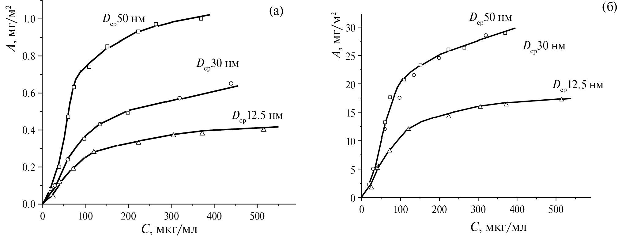 Влияние размера внутреннего диаметра нанотрубок на адсорбцию белков. Эту зависимость проследим на примере адсорбции бычьего сывороточного альбумина (БСА) на трёх образцах галлуазита, различающихся внутренними диаметрами нанотрубок (рис. 6). Из изотерм, приведённых на рис. 6а, видно, что адсорбция (в мг/м2) возрастает с увеличением внутреннего диаметра галлуазита. Адсорбция в мг/г (рис. 6б) одинакова на образцах со средними диаметрами нанотрубок 30 и 50 нм. Аналогичные зависимости получены и для других исследованных белков (табл. 3). Зависимость адсорбции БСА от размера пор пористых стекол, силикагелей и силохромов наблюдали ранее авторы [22]. Показано также, что скорость адсорбции белков выше на кремнезёмах с бóльшими порами [21].