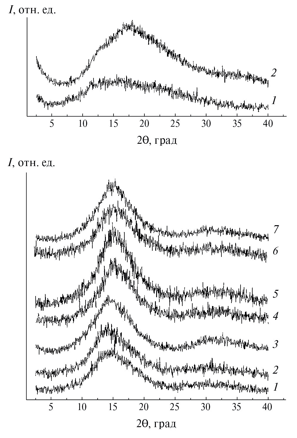 Рис. 2. Дифрактограммы образцов: а – линейный ПИ (1) и линейная ПМАК (кривая 2); б – графт-СП с привитыми боковыми цепями ПМАК с различной степенью полимеризации m, равной 60 (1), 65 (2), 120 (3), 125 (4), 180 (5), 250 (6) и 270 (7)