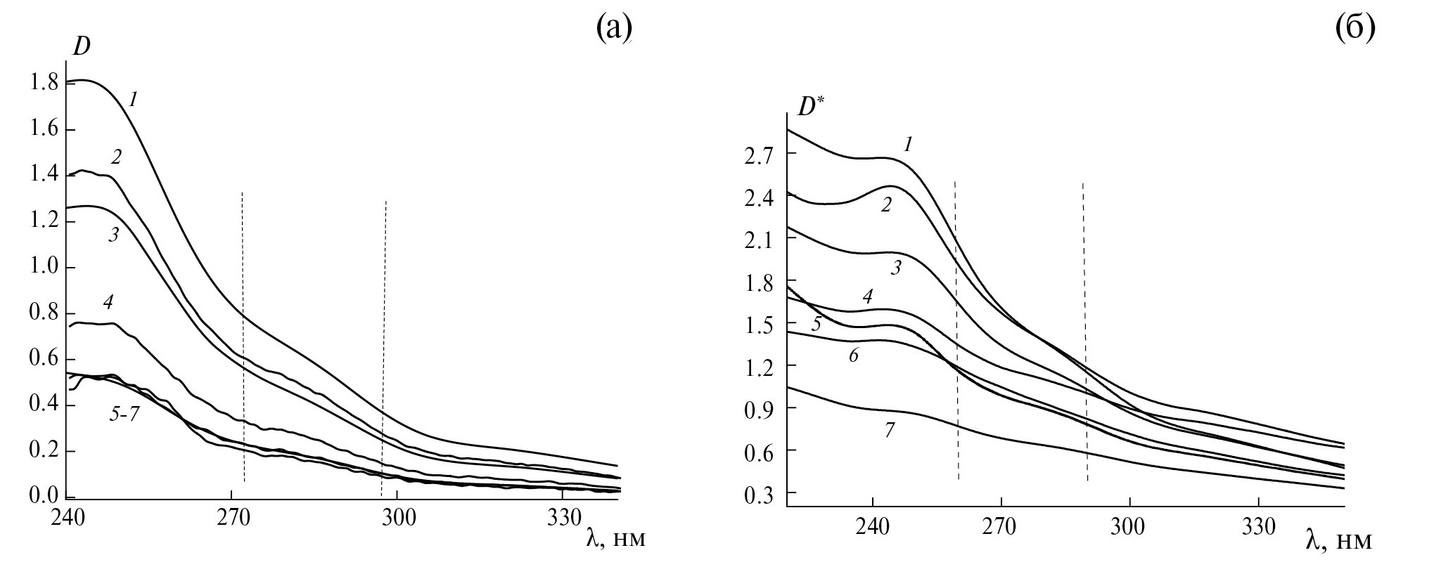 Рис. 3. Оптические спектры поглощения: а – свободных амфифильных молекулярных щеток (графт-СП), б – графт-СП, загруженных НЧ селена Se0; при варьировании степени полимеризации m боковых цепей ПМАК: 1 – 60, 2 – 65, 3 – 120, 4 – 125, 5 – 180, 6 – 250, 7 – 270
