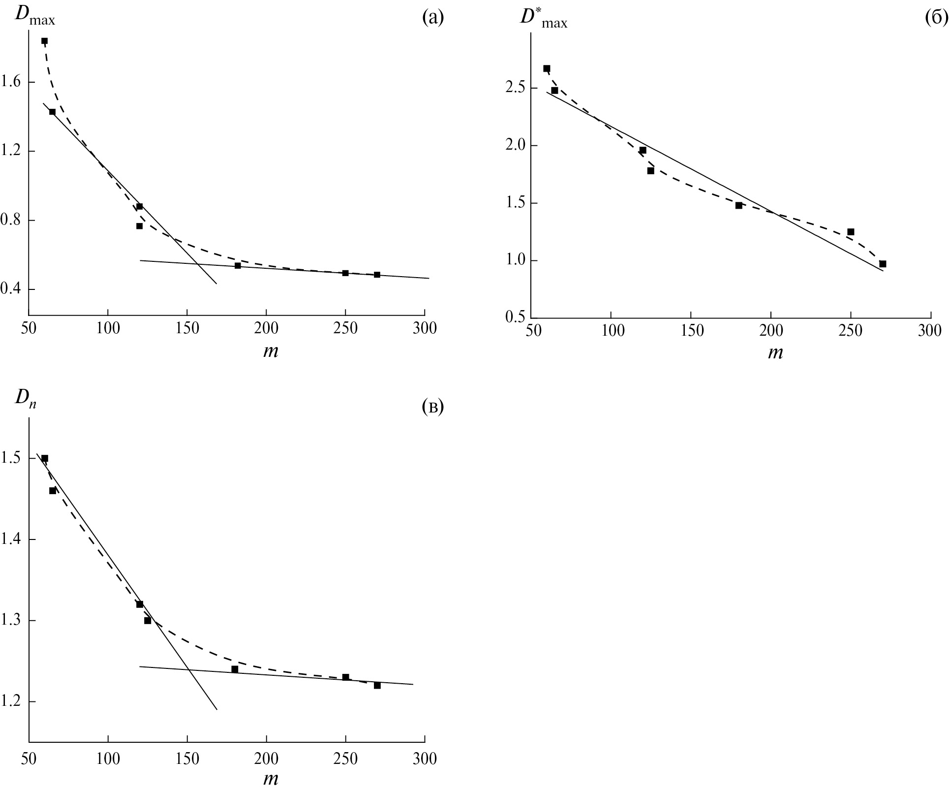 На рис. 4а представлена зависимость Dmax= f(m), которая имеет параболический вид и описывается уравнением Dmax=2.81–0.0022 m+ +5.02×10-5m2 (расчет проведен в программе Origin 8). Касательные, проведенные к ветвям параболы, пересекаются в точке m = 160, что находится в непосредственной близости к предполагаемой на основании спектральных данных и данных РСА особой точке m = 180.