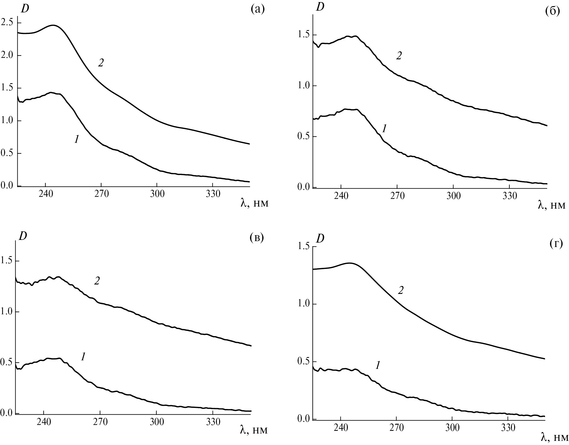 Рис. 5. Спектры поглощения свободных щеток (1) и соответствующих щеток, загруженных НЧ селена (2), при варьировании параметра m: 65 (а), 125 (б), 180 (в), 250 (г)