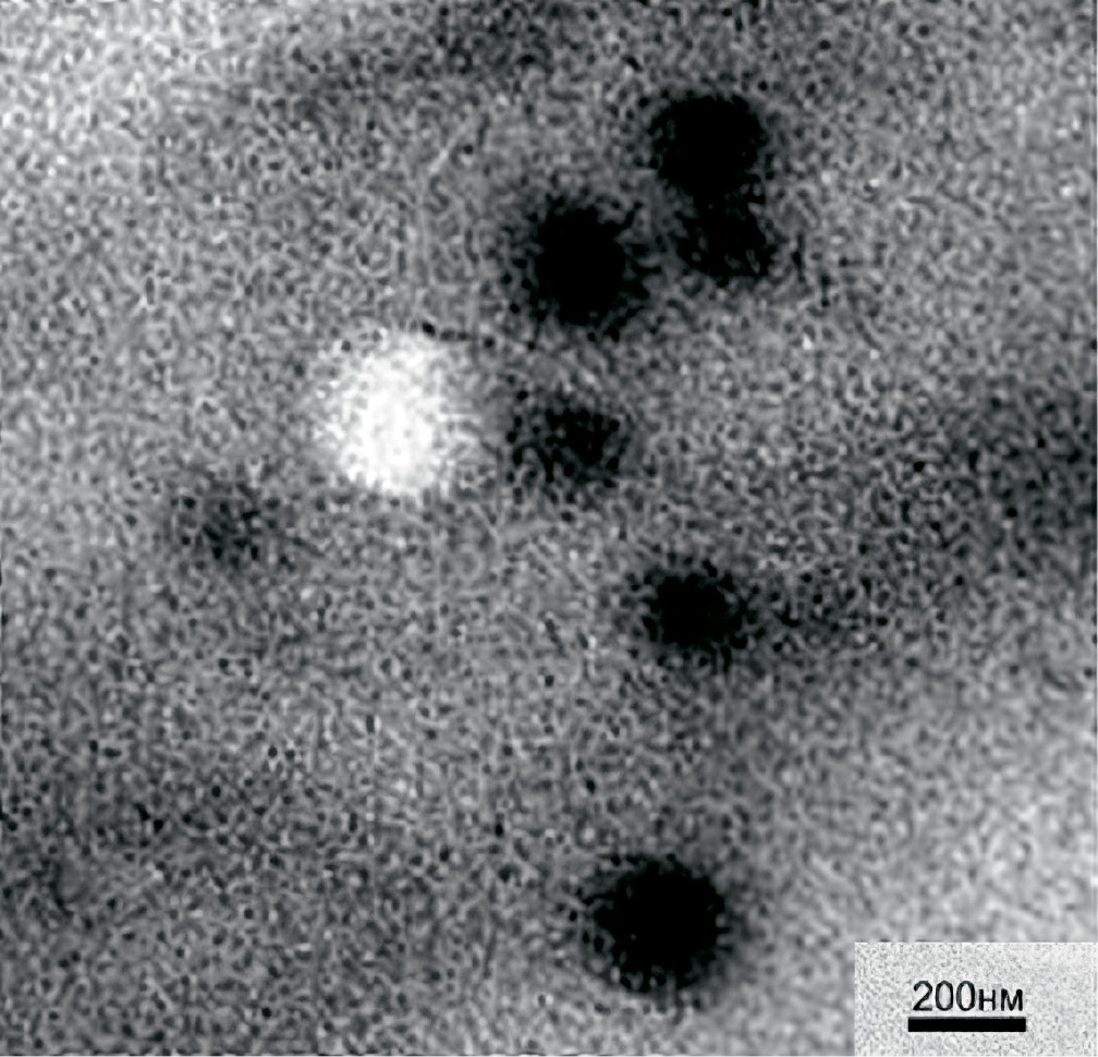 На рис. 8 представлена микрофотография селенсодержащей нанодисперсии Se0/графт-СП (m=180), полученная методом ПЭМ. Для этой наносистемы наблюдаются объекты двух типов: 1) сплошные дискретные наноструктуры с достаточно узким распределением по размерам: DПЭМ = 100–300 нм; 2) полые «сферы» диаметром DПЭМ = 300 нм (эти объекты по форме и размерам совпадают с теми, что наблюдались методом АСМ для «капсул»).