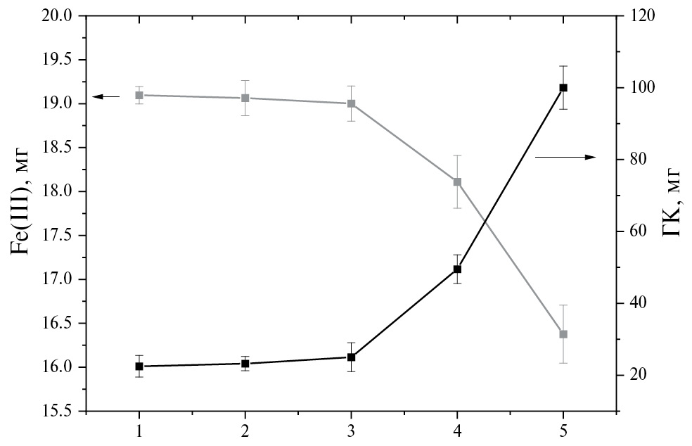 Одновременное осаждение ГКмод и Fe(III) в соотношении 1:1.18 формирует труднорастворимый гуминовый комплекс, в котором Fe(III) занимает активные центры ГК не полностью. Сорбционные показатели Cd(II) и Cr(VI) комплексным гуминовым сорбентом выше, чем гуминовых кислот и составляют 76 и 61 мг/г. Однако в случае Cd(II) самопроизвольная десорбция наступает через 5 ч взаимодействия и снижает адсорбционную емкость сорбента до 55 мг/г.
