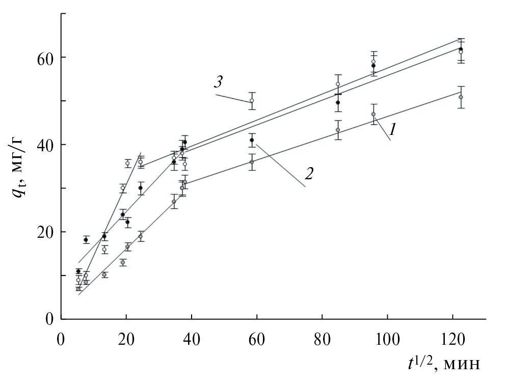 Рис. 6. Внутричастичная диффузионная модель адсорбции ионов в координатах Вебера – Морриса гуминовым комплексом ГКмодFe: 1 – Cd(II) из смешанного раствора, 2 – Cr(VI) из смешанного раствора, 3 – Cr(VI) из индивидуального раствора