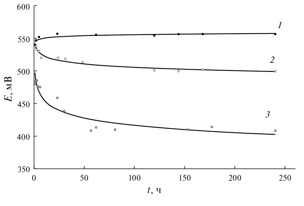 Рис. 8. Изменение окислительно-восстановительного потенциала водных растворов во времени, рН 3.8–4.0: 1 – Fe(OH)3 + Cd(II)+Cr(VI); 2 – ГКмодFe + Cd(II)+Cr(VI); 3 – ГКмодFe + Cr(VI)