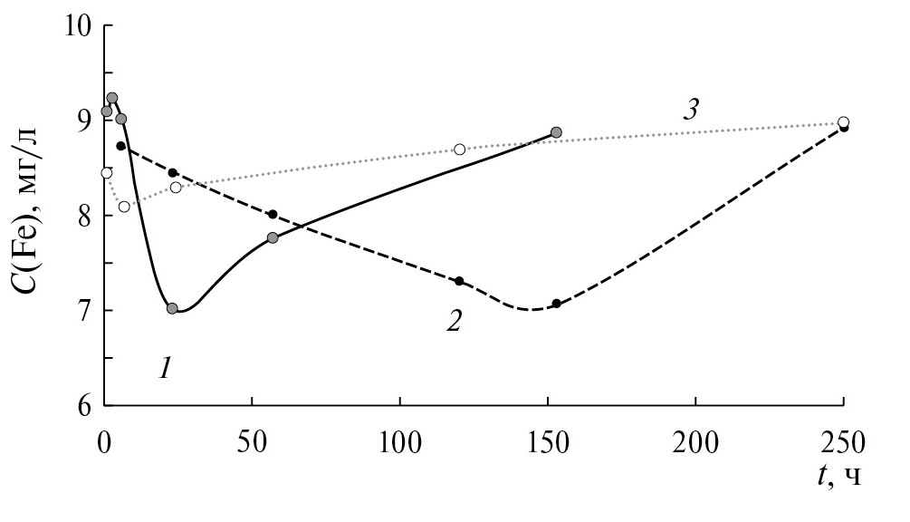 На рис. 9 приведены результаты равновесной концентрации Fe(II) после взаимодействия с Cd(II) (рис. 9, 1), с Cr(VI) (рис. 9, 2) и в присутствии смеси ионов Cd(II)+ Cr(VI) (рис. 9, 3). Окисление Fe(II) и сорбция Cd(II) (рис. 4) из раствора происходили одновременно. Так, процесс заселения активных центров ГКмодFe завершился через 24 ч и привел к снижению концентрации Fe(II). Возможно, происходила частичная передача электронов от Fe(II) к ГКмодFe. После достижения предельной сорбционной емкости сорбента десорбция Cd(II) запустила процесс восстановления Fe(III) в комплексном сорбенте до Fe(II).
