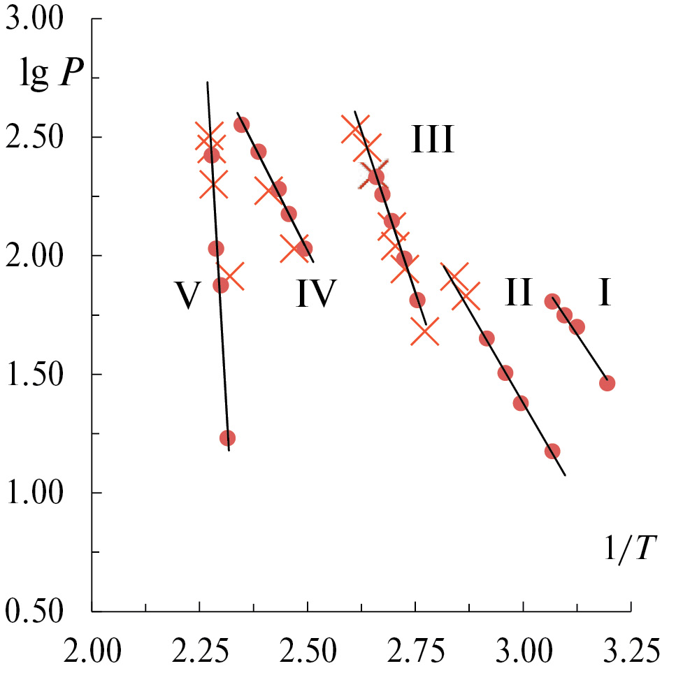 Рис. 3. Зависимости lgP от обратной температуры ступеней (I–V) процесса парообразования Th(NO3)4•5H2O.