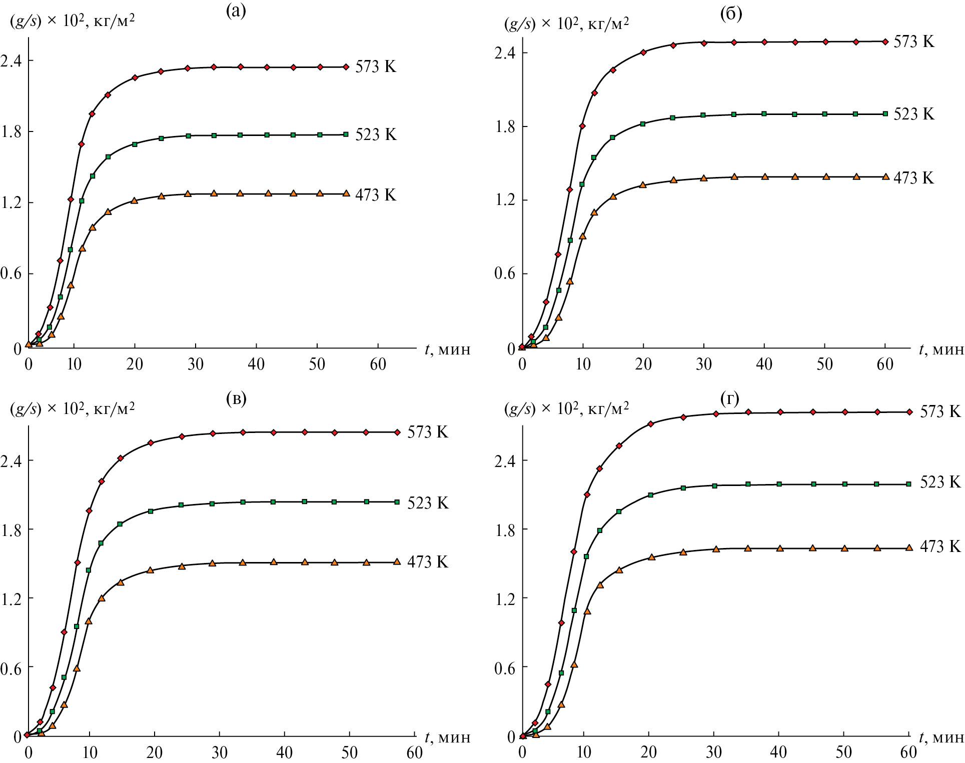 Рис. 2. Кинетические кривые окисления сплава ССу3 (а) с литием: 0.1 (б), 0.5 (в), 1.0 мас.% (г).