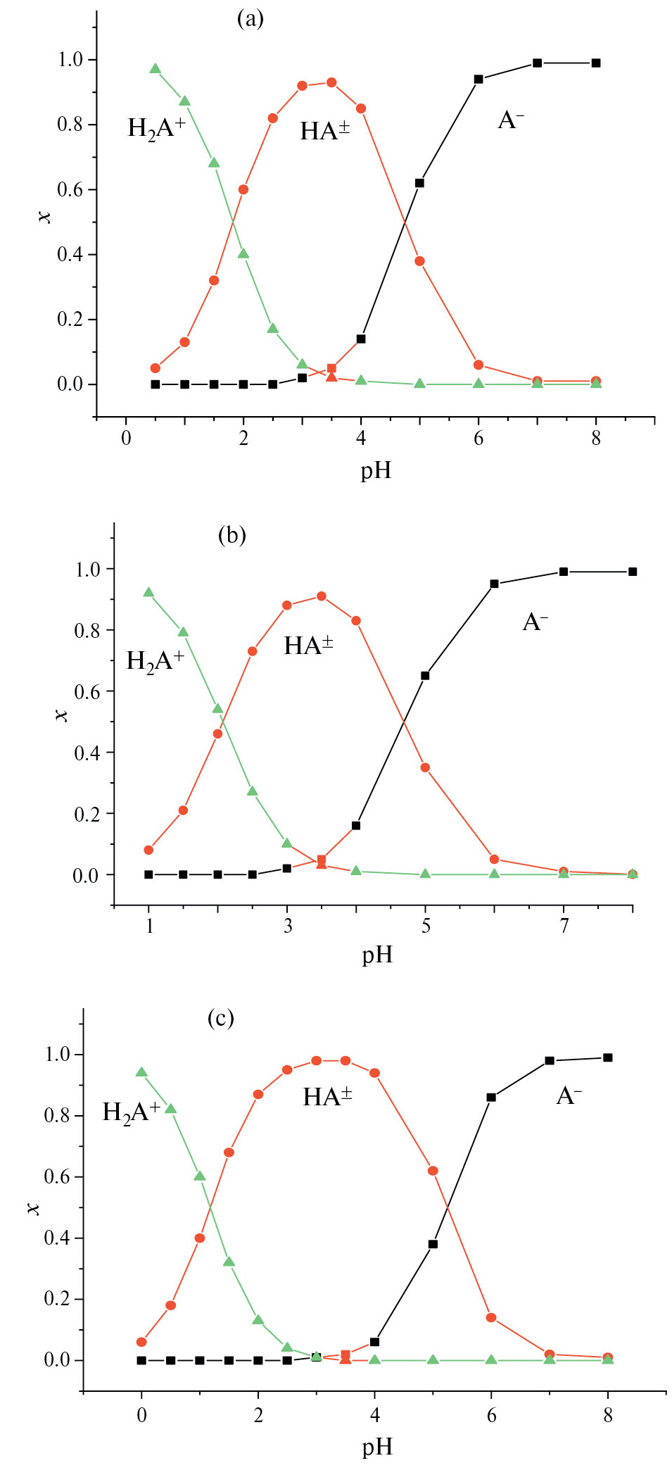 На рис. 1 представлены диаграммы долевого распределения ионных форм исследуемых пиридинкарбоновых кислот при изменении рН среды, полученные с помощью программы «RRSU», в основу которой заложен модифицированный метод Бринкли [25–27].