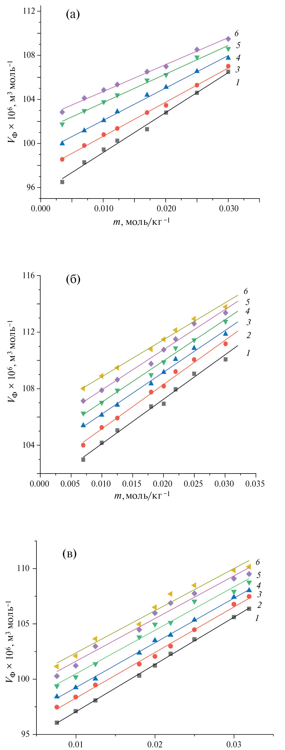 Рис. 2. Концентрационные зависимости кажущихся молярных объемов (Vj) пиколиновой (а), изоникотиновой (б) и никотиновой (с) кислот в водном буферном растворе при температурах: 288.15 (1), 293.15 (2), 298.15 (3), 303.15 (4), 308.15 (5), 313.15 K (6).
