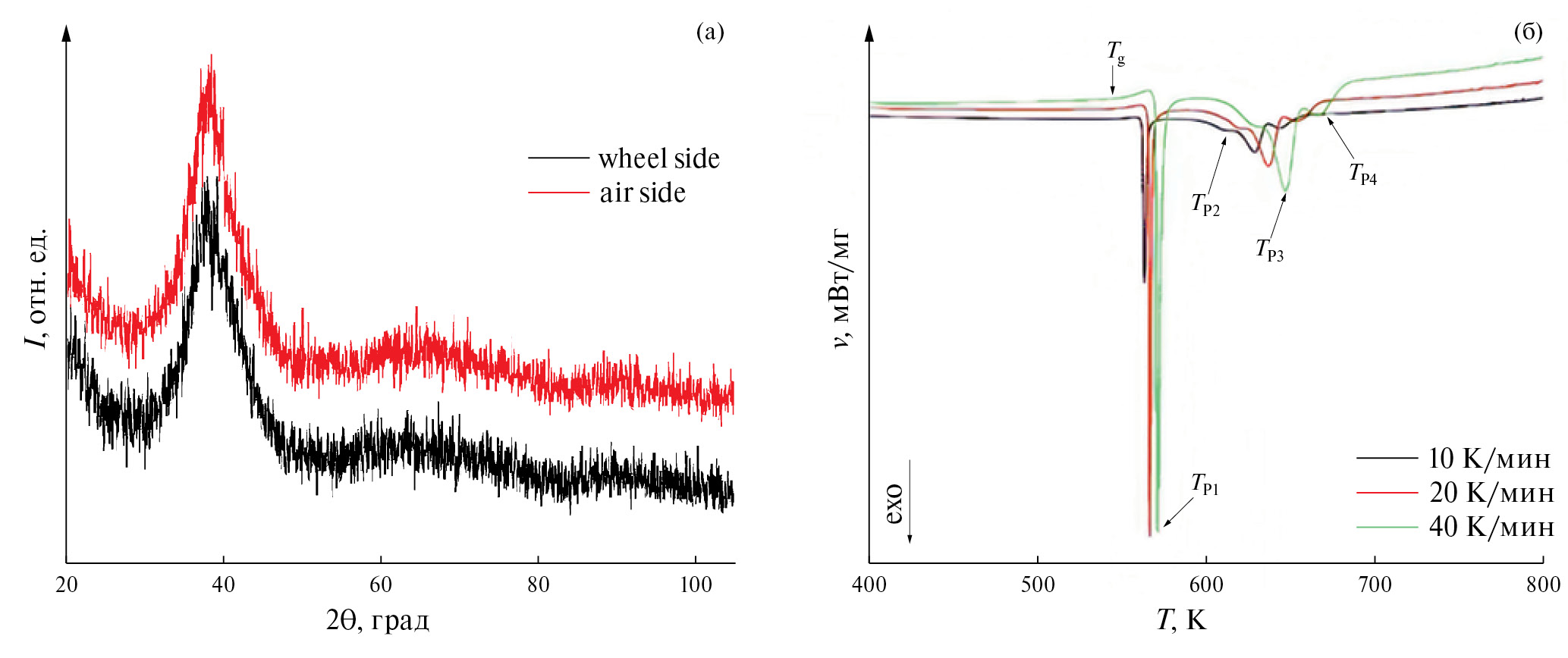 Рис. 1. Дифрактограммы (а) и термограммы (б), полученные при различных скоростях нагрева, быстрозакаленной ленты Al86Ni4Co4Tb6. Стрелками показаны температура стеклования (Tg) и температуры пиков различных стадий кристаллизации (TP1-4).