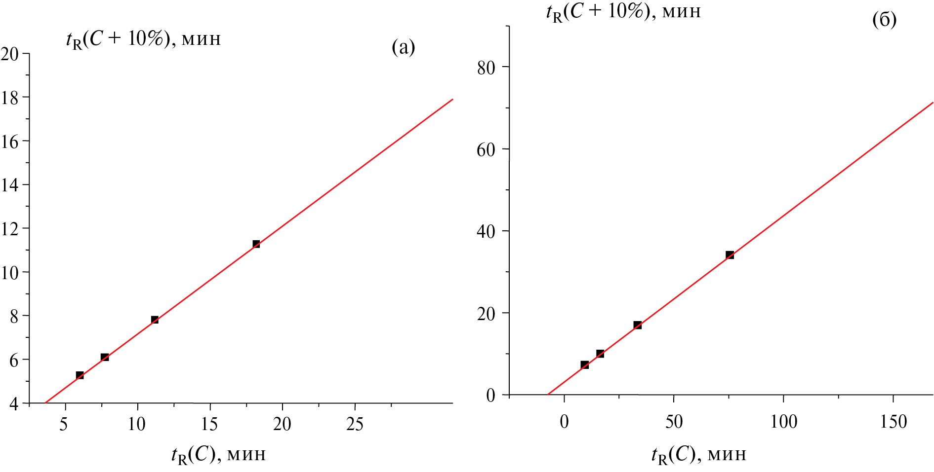 Исходная предпосылка выявления факторов, влияющих на времена удерживания сорбатов, состоит в том, что при отсутствии каких-либо аномалий рекуррентные зависимости (4) линейны (коэффициенты корреляции превышают 0.999). Этот факт был неоднократно отмечен ранее [29], но, учитывая его особую важность, представляется целесообразным дополнительно его проиллюстрировать. Примером таких соединений являются, например, н-алкилфенилкетоны – реперные компоненты для определения индексов удерживания в ОФ ВЭЖХ. На рис. 1 приведены соответствующие зависимости для ацетофенона (а) и бутирофенона (б).