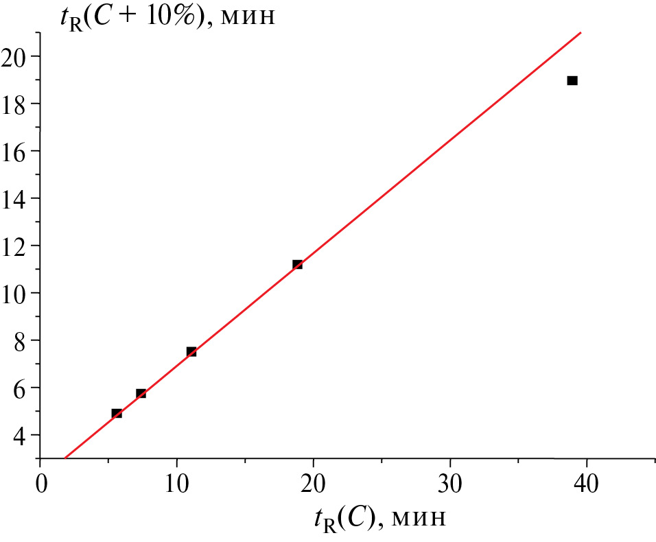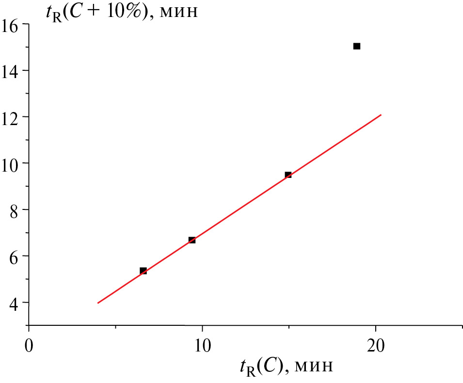 И, наконец, для оксимов 4-метилбензальдегида и 4-гидроксибензальдегида зарегистрированы не встречавшиеся ранее аномалии рекуррентной аппроксимации времен удерживания. Точки tR(30)–tR(40), соответствующие наибольшему содержанию воды в элюенте, отклоняются не вниз, а вверх от линий регрессии. Рисунок 3 иллюстрирует такую аномалию на примере оксима 4-метилбензальдегида.