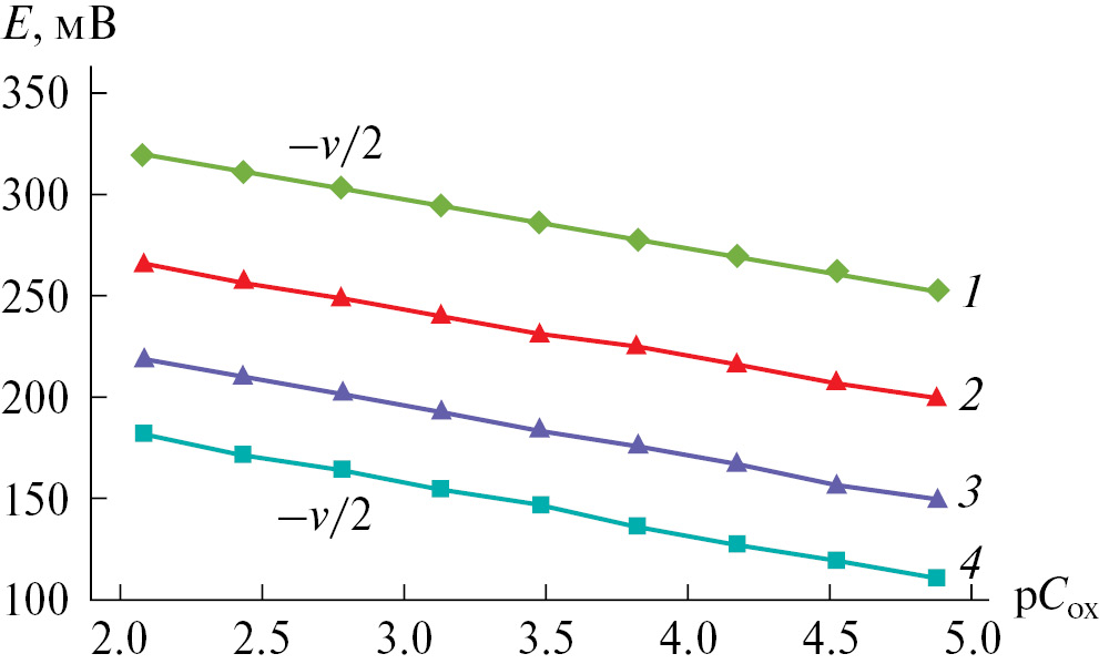 Рис. 2. Зависимости ЭДС (Е, мВ) от рСох для системы Cu(Hg)-Cu(II)-L-Ala-Н2О при температуре 298.15 К и ионной силе раствора 1.0; СCu2+ = 0.001; СL = 0.01 моль/л. Кривые относятся к рН: 1.60 (1), 3.50 (2), 5.50 (3), 8.40 (4)