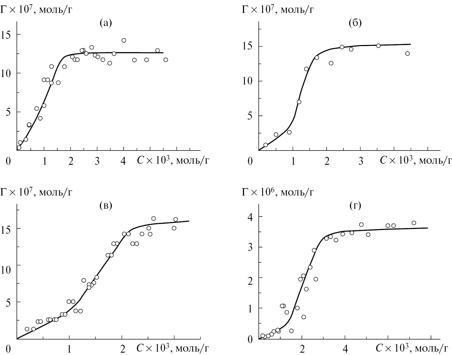 Рис. 1. Интегральные изотермы сорбции карбоновых кислот на поверхности дисперсного льда из водного раствора с фоновым электролитом KCl: уксусной (а), муравьиной (б), монохлоруксусной (в) и трихлоруксусной (г)