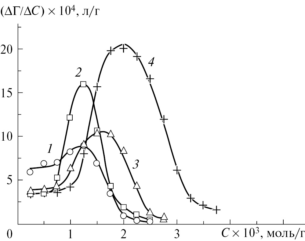 Рис. 2. Дифференциальные изотермы сорбции карбоновых кислот на поверхности дисперсного льда из водного раствора с фоновым электролитом KCl: уксусной (1), муравьиной (2), монохлоруксусной (3) и трихлоруксусной (4)