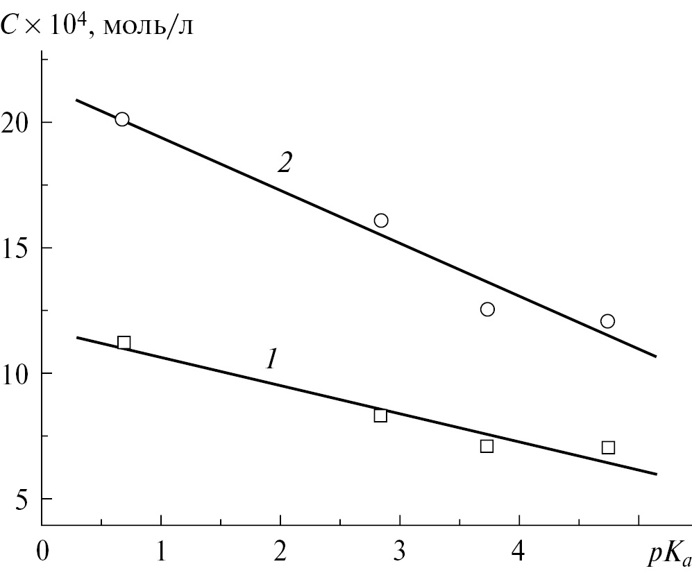 Начало замедления сорбции определяется на интегральных кривых точками перегиба, а на дифференциальных, соответственно, максимумами. Концентрации, связанные с точками перегиба, для кислот различны. Обратная линейная взаимосвязь их с показателями кислотности (см. рис. 3, линия 1) свидетельствует о том, что подплавление твердой фазы льда для более сильных кислот начинает замедляться при более высоких концентрациях. Следовательно, с увеличением кислотности в квазижидкую пленку в целом может переходить большее количество кислоты. Концентрации кислот, обусловливающие завершение процесса подплавления, также линейно взаимосвязаны со значениями показателя кислотности исследованных карбоновых кислот (см. рис. 3, линия 2). Линейные зависимости 1 и 2 характеризуют разные процессы, поэтому имеют разные углы наклона по отношению к осям координат.