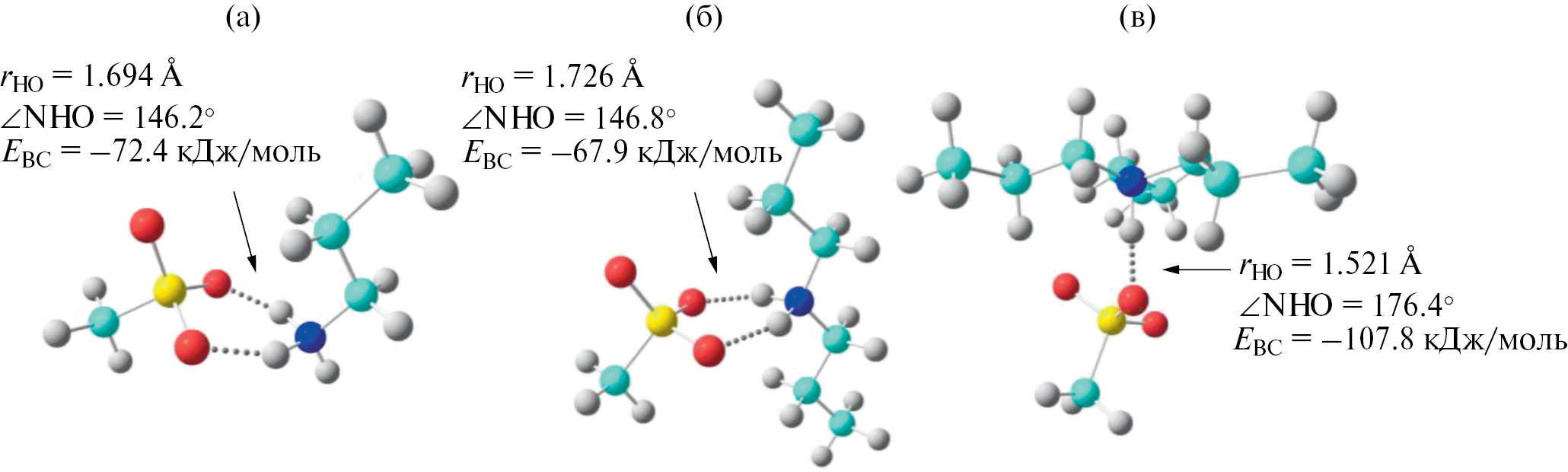 Данная работа посвящена изучению структуры ионных жидкостей на основе катионов пропиламмония ([С3Н7NH3]+ = PrA), дипропиламмония ([(С3Н7)2NH2]+ = DPrA) и трипропиламмония ([(С3Н7)3NH]+ = TPrA), содержащих в качестве противоиона мезилат анион ([СН3SO3]– = MsO). Надо сказать, что на настоящий момент данные по физико-химическим свойствам изучаемых соединений в литературе отсутствуют. На основании проведенных нами ранее квантово-химических расчетов [27] проанализировано влияние катиона на структурно-энергетические характеристики ионных пар данных ПИЖ (рис. 1). Выявлено, что число и сила водородной связи в ионных парах зависят от типа катиона, входящего в их состав. Катионы PrA и DPrA склонны образовывать с мезилат-анионом две водородные связи равной силы. При этом каждая связь в обеих ионных парах слабее, чем связь в ионных парах с катионом TPrA. Эти особенности строения типичны для алкиламмониевых ПИЖ, однако в структурах ионных пар с катионами моно- и диалкиламмония и анионами других кислородсодержащих кислот прослеживается неэквивалентность параметров водородных связей [13, 20]. Для ионных пар с мезилат анионом отмечено ослабление ион-ионного взаимодействия в ряду катионов PrA→DPrA→TPrA. Вероятные причины – уменьшение энергии водородной связи за счет сокращения числа атомов водорода при аминогруппе катиона и ослабление кулоновского взаимодействия из-за увеличения размера катиона.