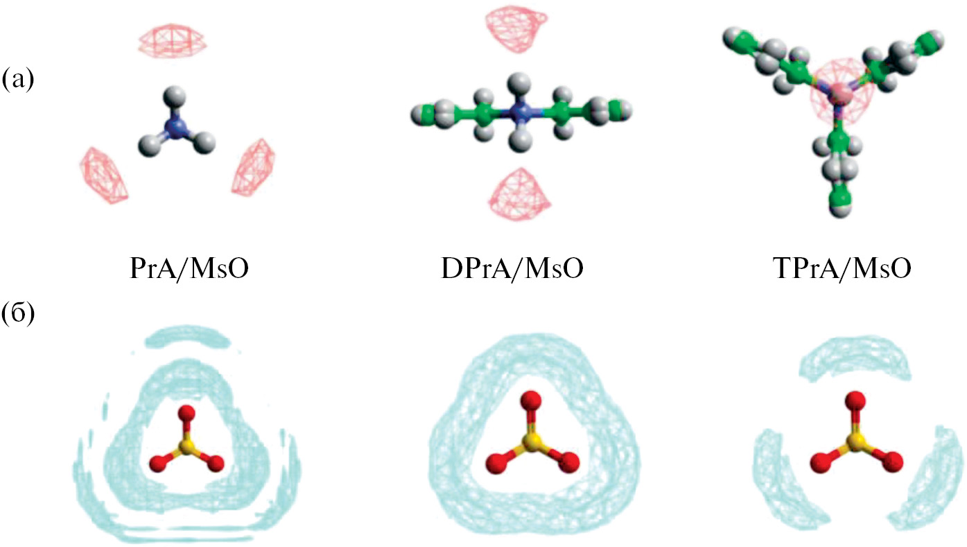 Наглядно иллюстрировать локализацию ионов в протонных ионных жидкостях можно с помощью пространственных функций распределения (ПФР) (рис. 3). Как следует из рис. 3а, для всех трех жидкостей существуют четкие области повышенной концентрации атомов кислорода анионов вблизи атомов водорода аминогруппы катиона, что свидетельствует о высокой вероятности образования в жидкостях водородных связей. Однако ПФР атомов водорода аминогрупп катионов в пределах первой координационной сферы аниона для жидкостей заметно отличаются (рис. 3б). Для жидкостей с катионами PrA и DPrA атомы водорода аминогрупп катионов располагаются на некотором расстоянии от атомов кислорода аниона, образуя вокруг него непрерывную оболочку, что, по-видимому, связано с широким распределением углов водородной связи и многообразием структурных вариаций. Для TPrA/MsO атомы водорода аминогрупп катионов локализуются вблизи атомов кислорода аниона, что свидетельствует об образовании в жидкости водородно-связанных мотивов преимущественно с линейной геометрией водородных связей, что согласуется с данными квантово-химических расчетов, проведенных для ионной пары TPrA/MsO. Кроме того, молекулярно-динамическое моделирование ряда ПИЖ на основе катиона триэтиламмония ([(C2H5)3NH]+ = TEA) и анионов кислот различной силы, проведенное в работе [12], показало, что мотивы связывания анионов и катионов в ионные пары, обнаруженные на основе квантово-химических расчетов, сохраняются в объемной фазе этих жидкостей.