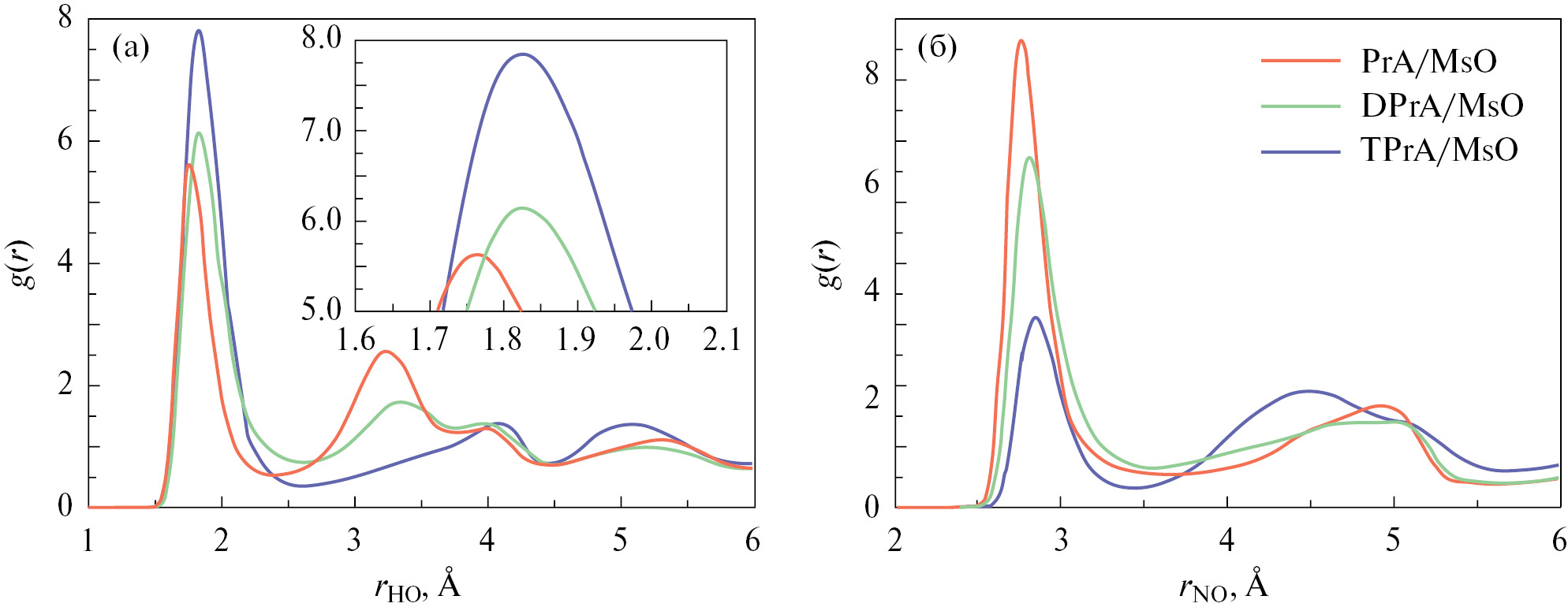 Рис. 3. ПФР атомов кислорода мезилат-анионов относительно атомов водорода аминогруппы катионов пропиламмония, дипропиламмония и трипропиламмония (а) и атомов водорода аминогруппы катионов относительно атомов кислорода анионов (б)