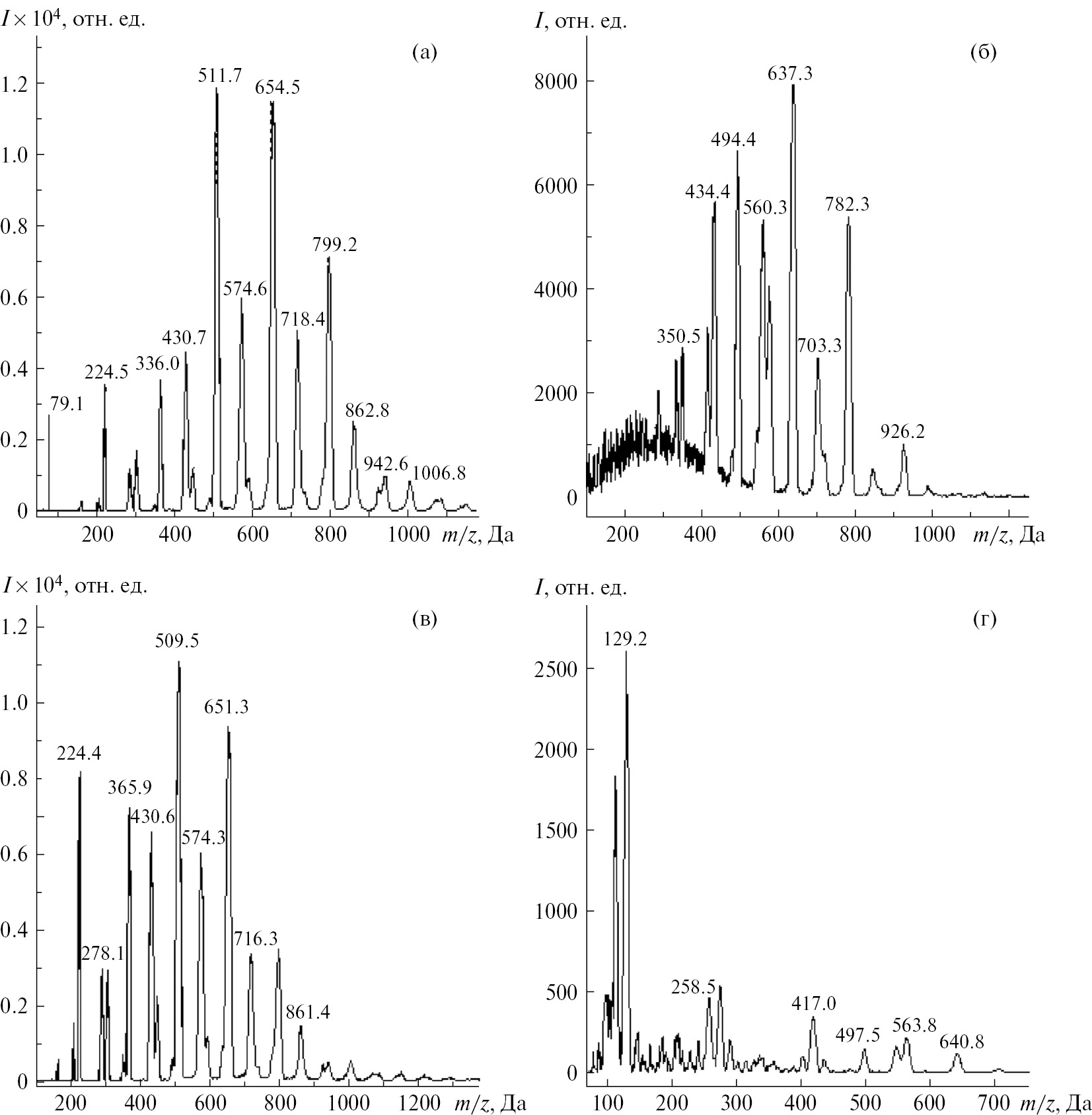Оборудование. Масс-спектрометрические исследования проводили на масс-спектрометре Bruker Daltonics Ultraflex II (производство Bruker, Германия), оснащенном азотным лазером с длиной волны 337.1 нм. В качестве инертной поверхности использовалась стандартная подложка из нержавеющей стали (Bruker, Германия). Эксперименты проводились в режимах регистрации как положительных, так и отрицательных ионов. Основные характеристики режимов ионизации (положительный/отрицательный): напряжение на выталкивающем электроде – 25/20 кВ; доускоряющее напряжение – 20/17.5 кВ; напряжение на системе фокусировки – 10.5/7.5 кВ; тормозящее напряжение на ионном зеркале – 26/21 кВ; отражающее напряжение на ионном зеркале – 14/11 кВ.