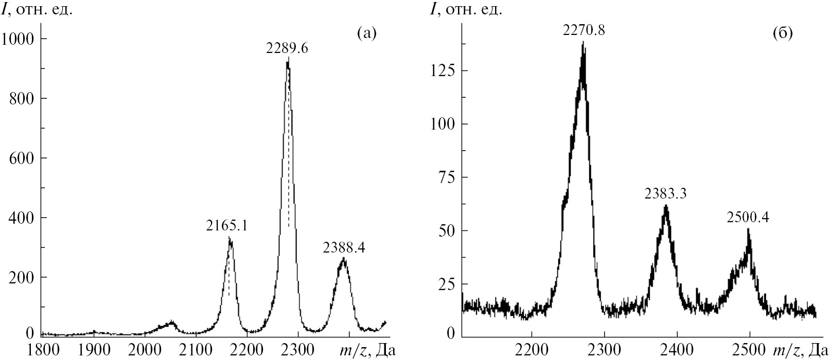Масс-спектры получали в широком диапазоне масс до 7000 Да, однако на рисунках ниже показаны только информативные части спектров.