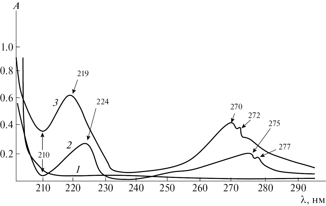 Рис. 1. Электронные спектры поглощения водных растворов ПК (1), Tyr (2), смеси ПК и Tyr (3); C ПК = 1.0×104 моль/л, СTyr = 1.0×10–4 моль/л, рН 7.0, l = 1.0 см, 25 °С