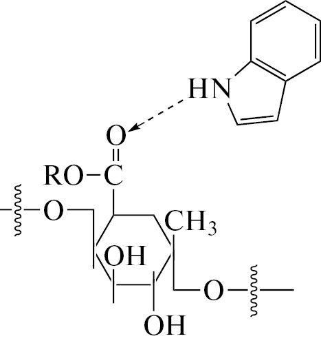 Факт образования комплексных соединений ПК-Tyr и ПК-Ind подтверждается данными 13С ЯМР и ИК-спектроскопии. Анализируя данные табл. 1, можно отметить уменьшение химсдвигов ядер 13С Ind в комплексе ПК-Ind практически для всех сигналов, кроме С3 и С9, линии которых значительно смещаются в сторону слабого поля. Незначительные химсдвиги атомов углеродов ароматического фрагмента индольного кольца (С4–С7) свидетельствуют о неучастии последнего в связывании с ПК. В ИК-спектре ПК-Ind наиболее значительные изменения зафиксированы для n(С=О) ПК (уменьшение интенсивности и высокочастотный сдвиг на 6 см–1 до 1741 см–1) и пиррольного атома азота Ind (уменьшение интенсивности и высокочастотный сдвиг на 9 см–1 до 3396 см–1). Кроме того, наблюдается уширение ПП n(–ОН) ПК, а также высокочастотный сдвиг ПП n(С–О) и n(С–С) колебаний пиранозного кольца полисахарида на 6–8 см–1.
